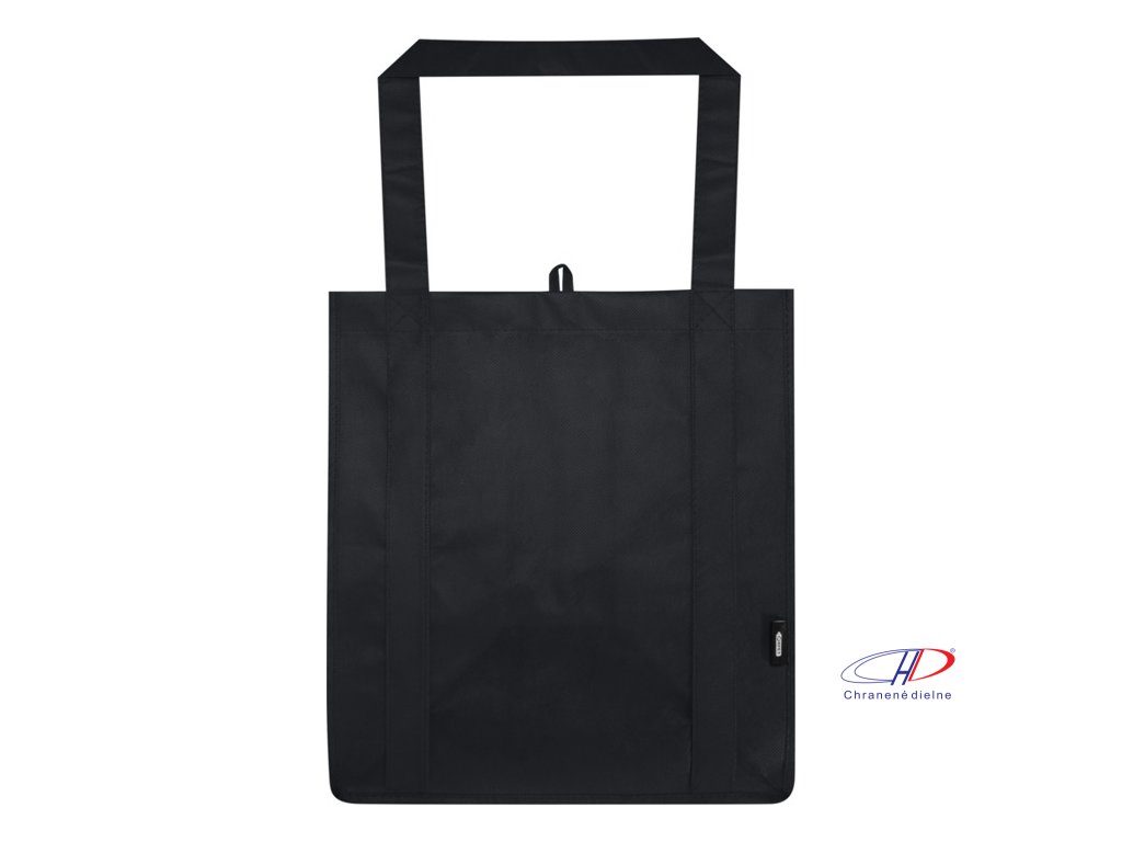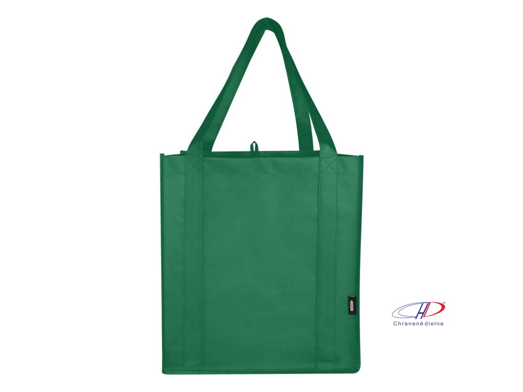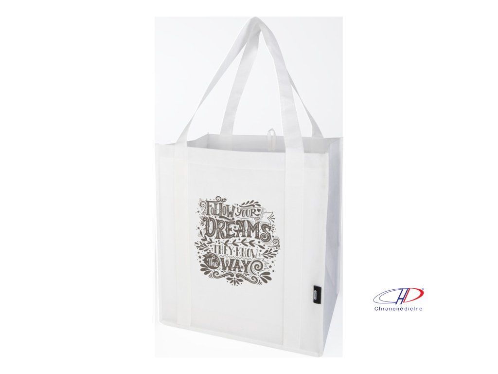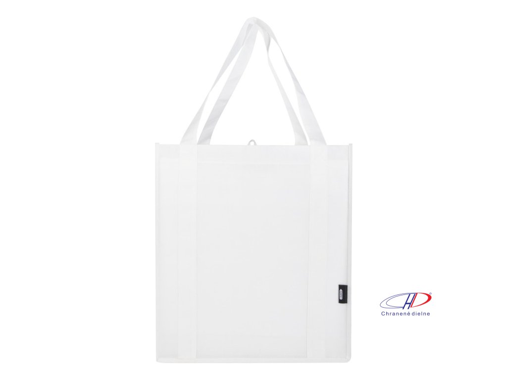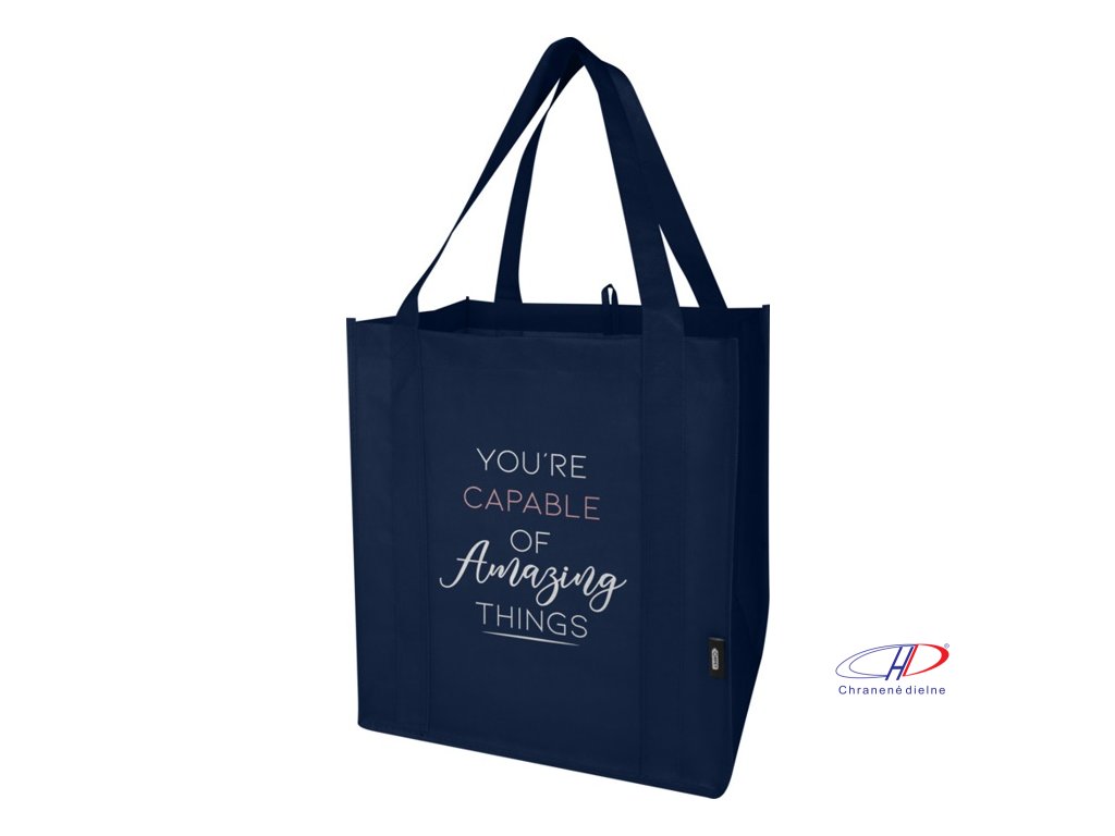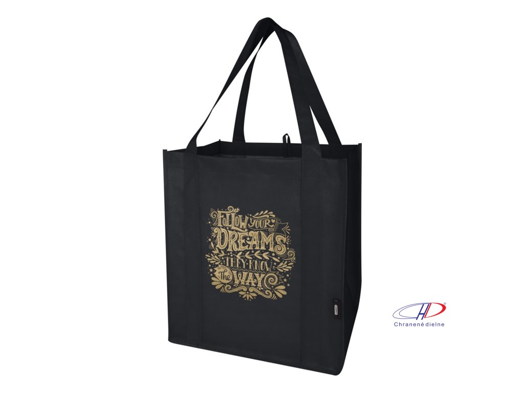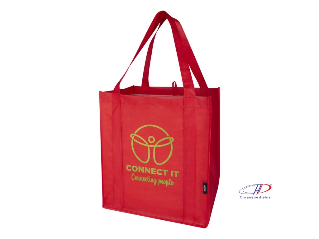 Recyklovaná nákupná taška Liberty s certifikáciou GRS vyrobená z odolného netkaného RPET má podpornú spodnú dosku, vďaka ktorej je univerzálna a pevná. Nákupná taška má veľkú hlavnú priehradku a uši s dĺžkou 25 cm. Objem: 29 litrov. Nosnosť do 12 kg.Dodatočné parametre