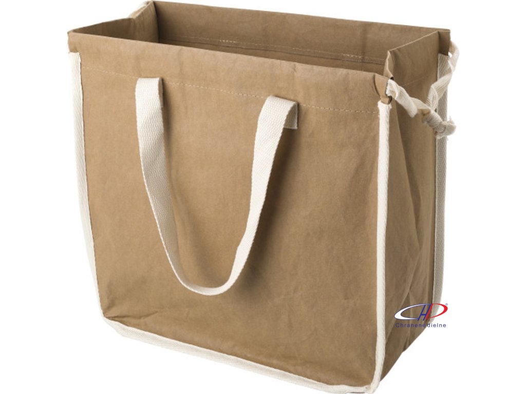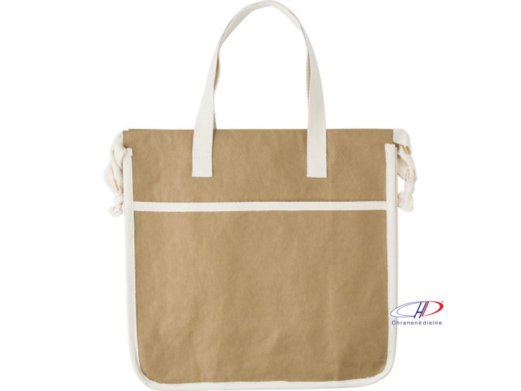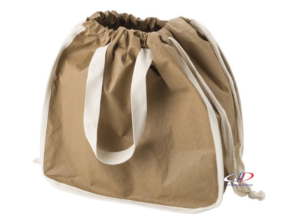 Umývateľná nákupná taška z kraftového papiera s TC (250 gr/m?) podšívkou. S dvoma krátkymi rúčkami a dvoma povrazmi na navlečenie tašky.Dodatočné parametre