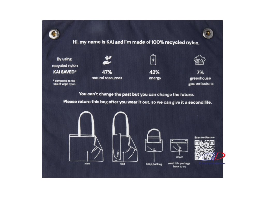 Taška je vyrobená z recyklovaného GRS nylonu s certifikáciou 200T. QR kód poskytuje ďalšie informácie o pôvode materiálov.Dodatočné parametre