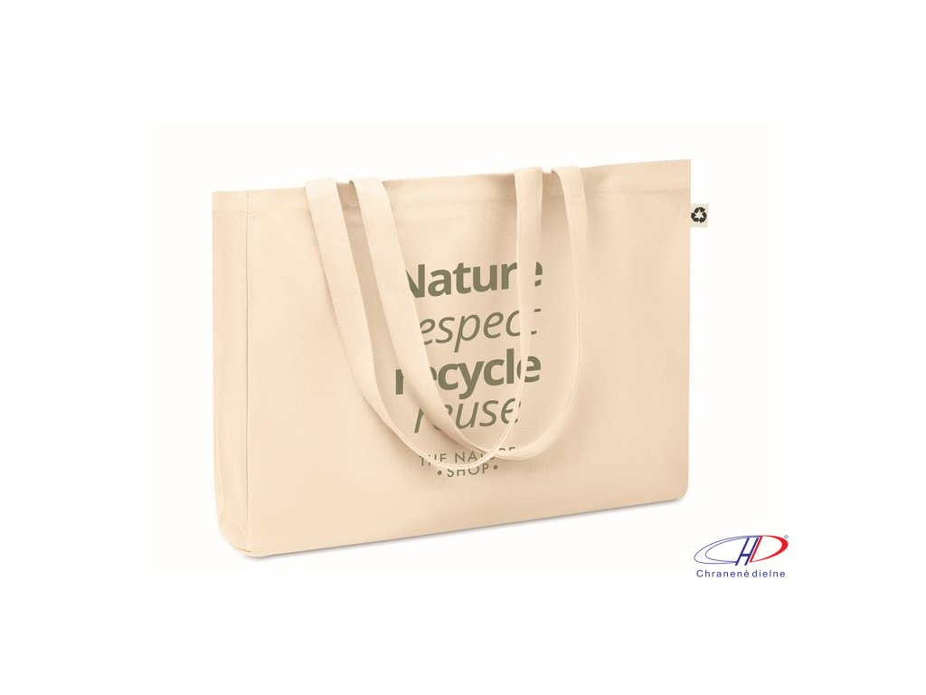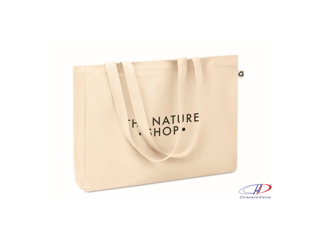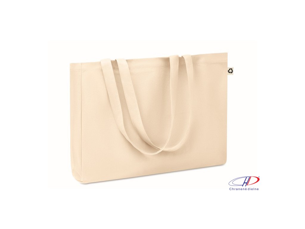 Nákupná alebo plážová taška z recyklovaného plátna s dlhými ušami a klinom. S gramážou 280 g/m2. 50% bavlna a 50% recyklovaná bavlna.