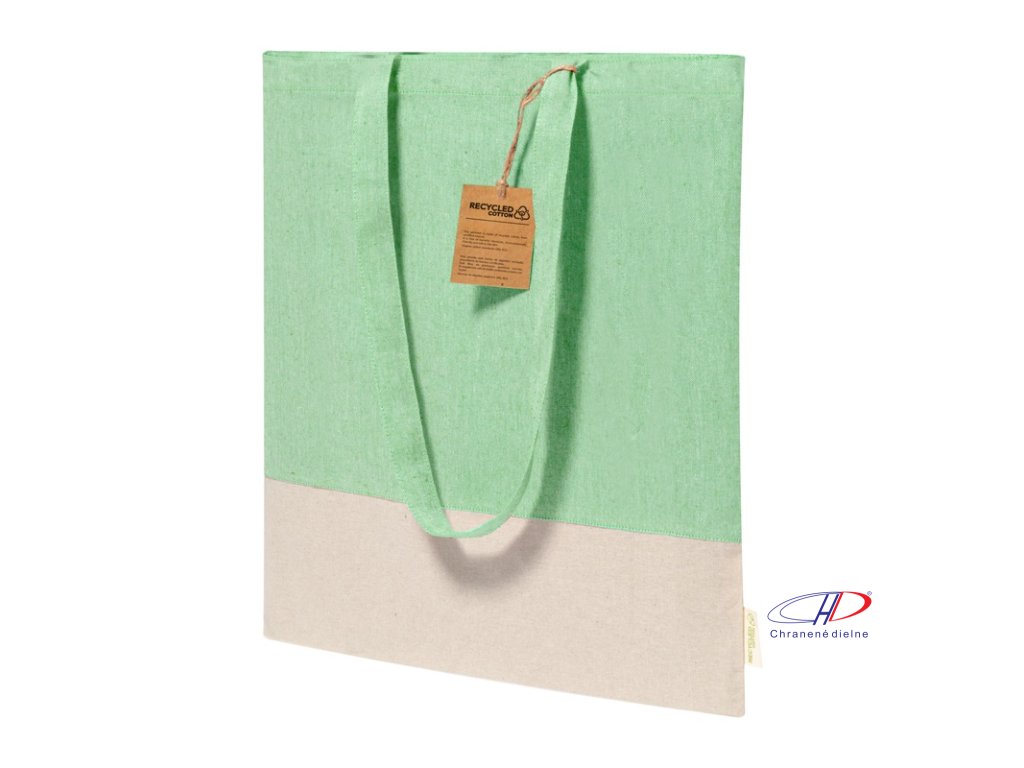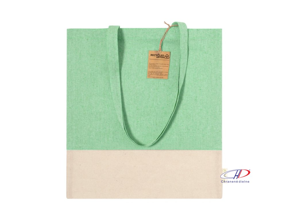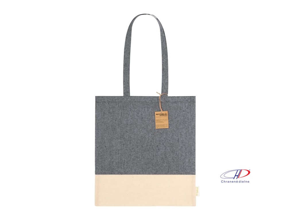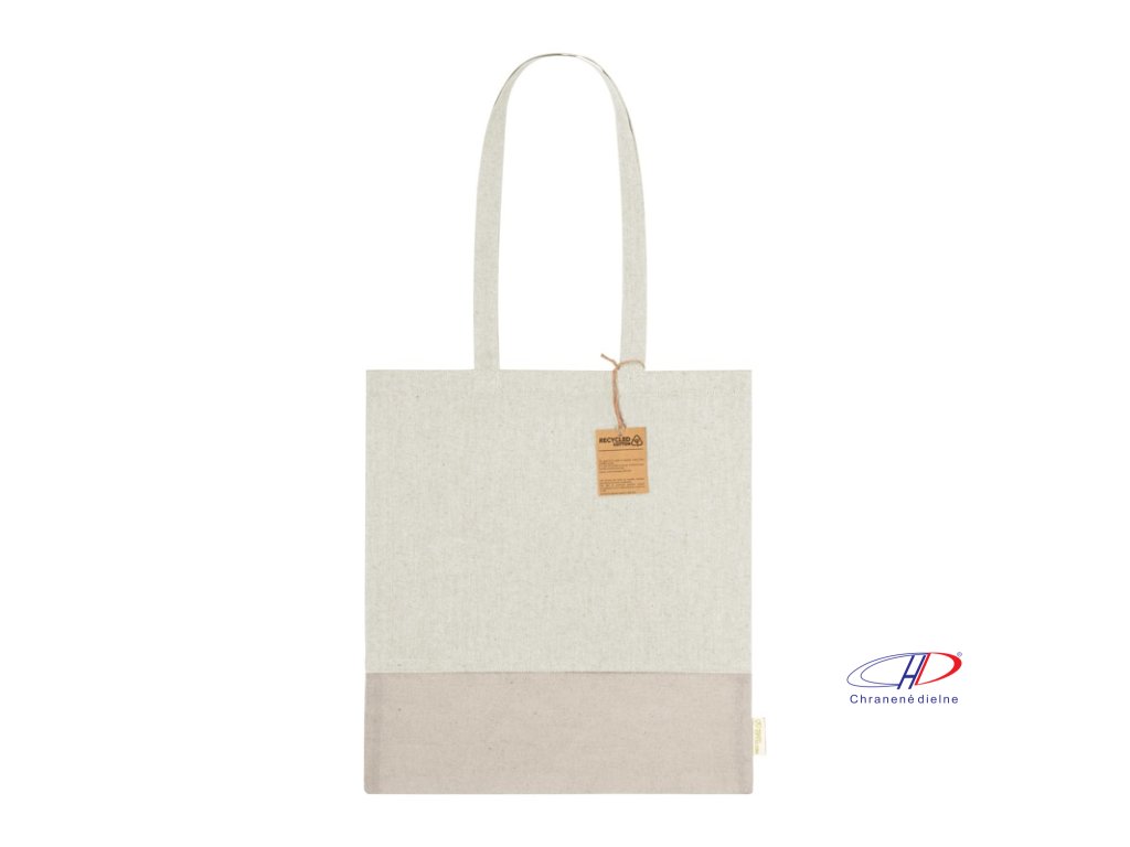 Dvojfarebná nákupná taška z recyklovanej bavlny s dlhými ušami a výrazným štítkom z recyklovanej bavlny. 100% recyklovaná bavlna, 120 g/m2.Dodatočné parametre