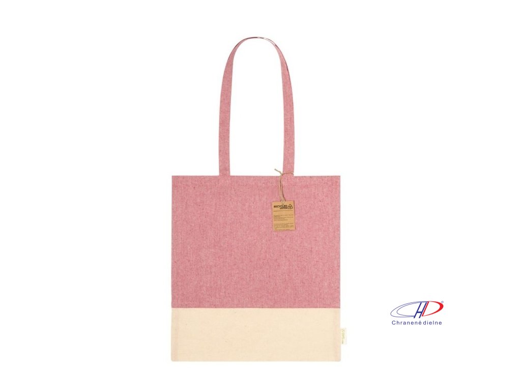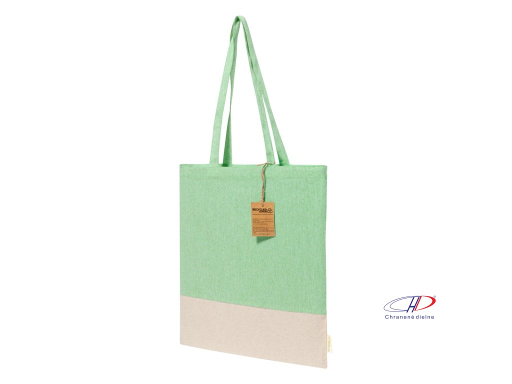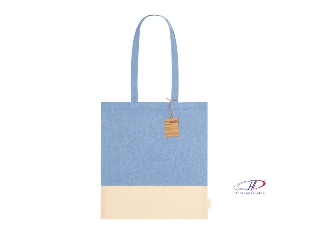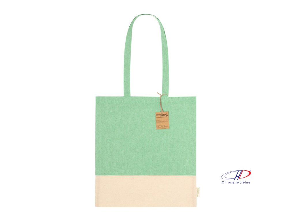 Dvojfarebná nákupná taška z recyklovanej bavlny s dlhými ušami a výrazným štítkom z recyklovanej bavlny. 100% recyklovaná bavlna, 120 g/m2.Dodatočné parametre