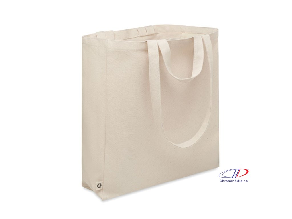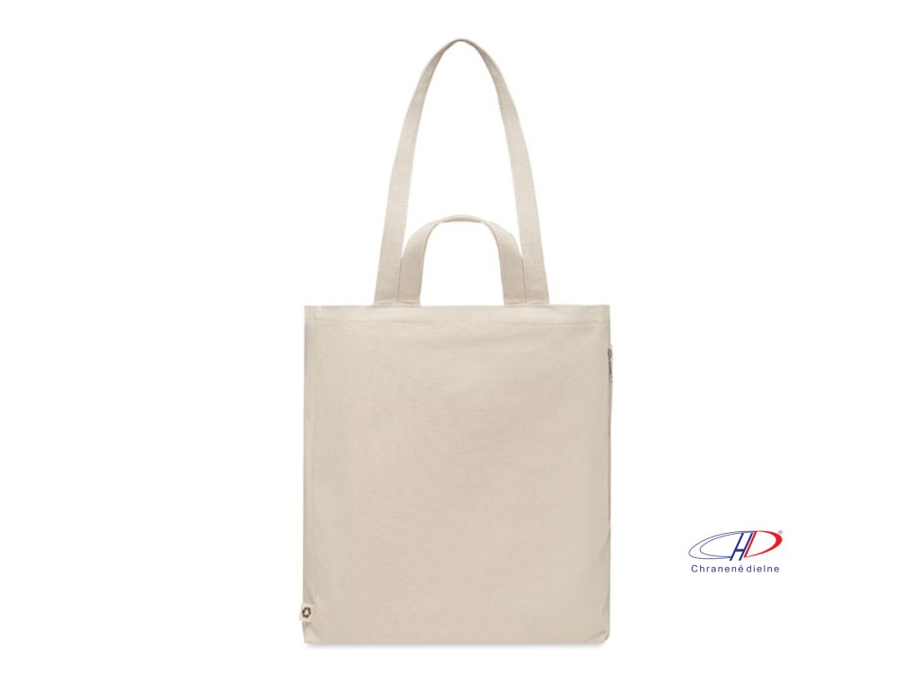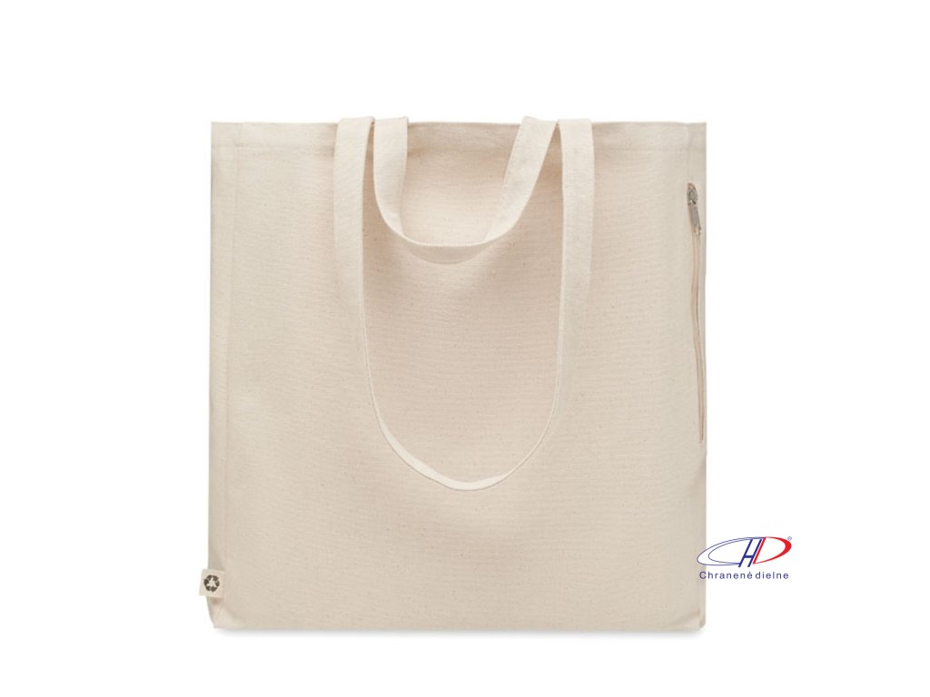 Nákupní nebo plážová 140 gr/m? taška z recyklované polybavlny (70 % recyklovaná bavlna, 30 % recyklovaný polyester) s krátkými uchy. Má boční kapsu na zip.