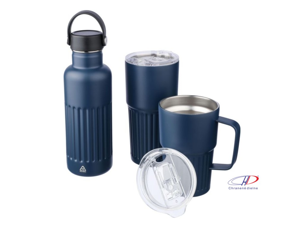 Hrnček z recyklovanej nehrdzavejúcej ocele (500 ml). Vnútorná strana z nehrdzavejúcej ocele 304 a vonkajšia strana z nehrdzavejúcej ocele 201 s rebrovaným úchopom. Má viečko AS s posuvným uzáverom. Jednotlivo balené v hnedej kartónovej krabici.Dodatočné parametre