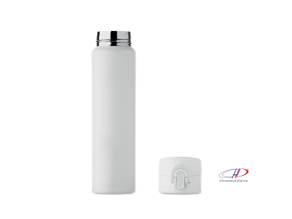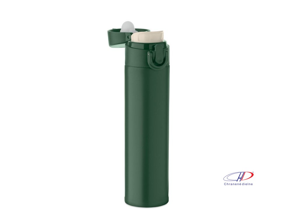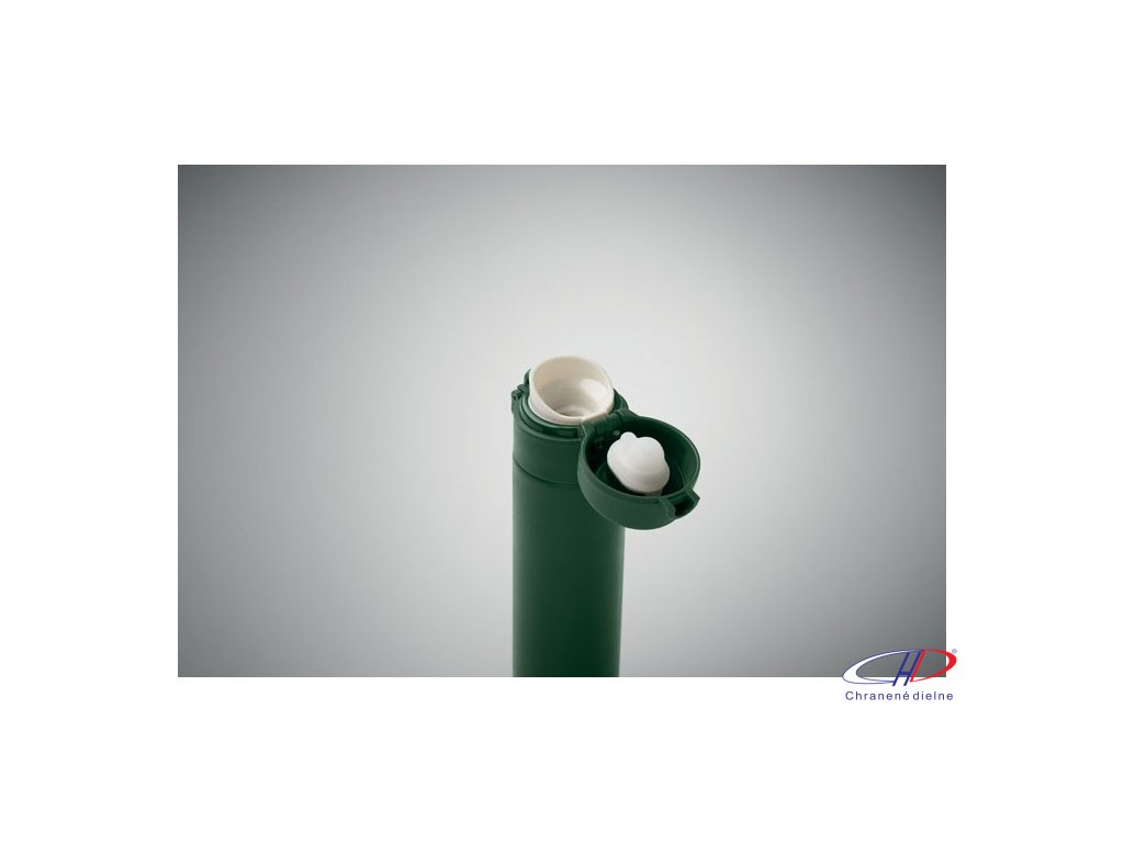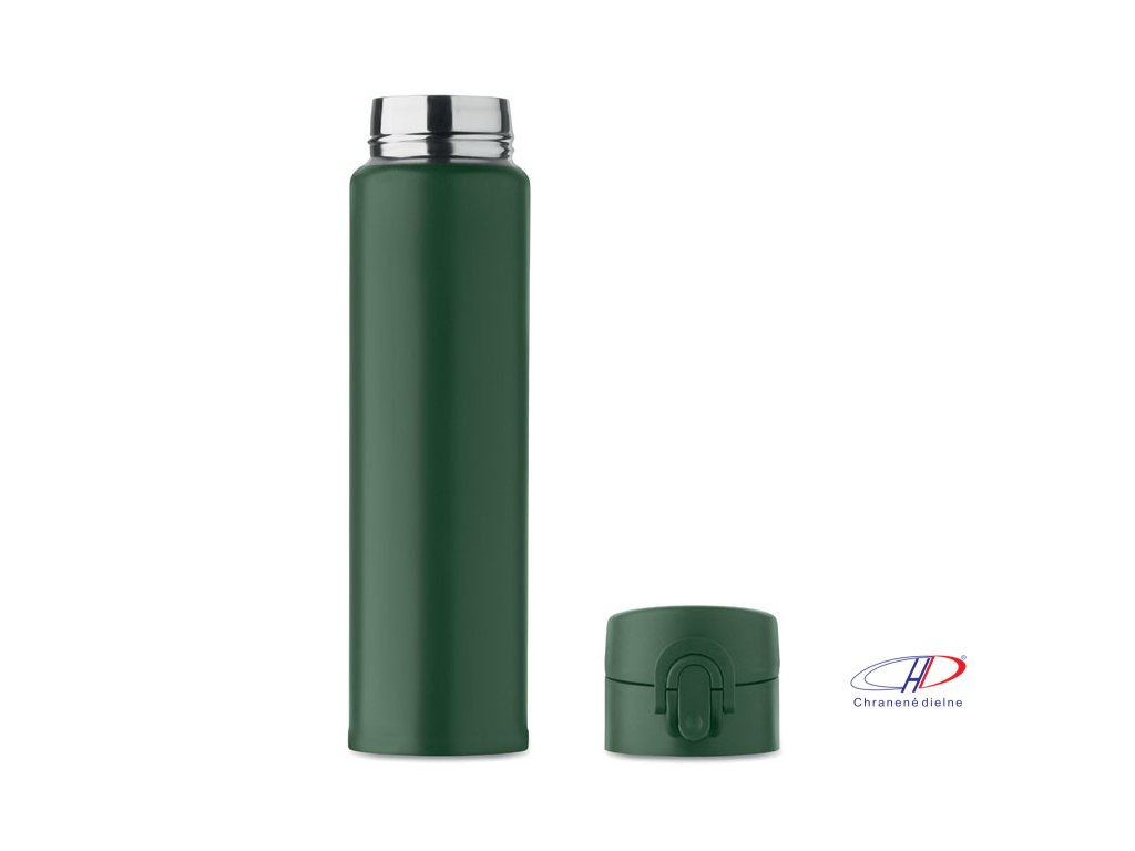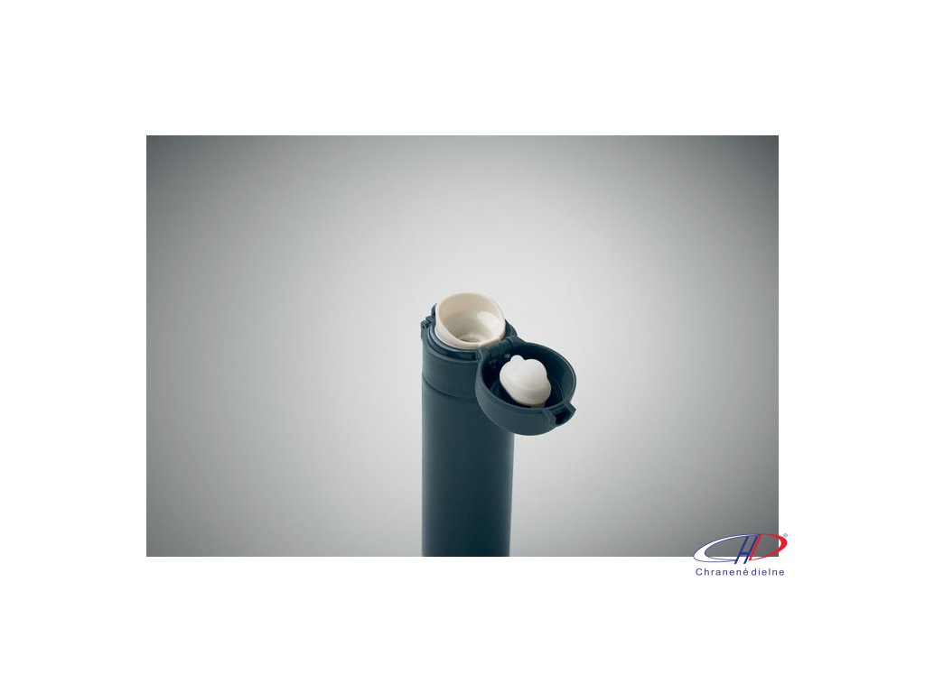 Dvojstenná fľaša na pitie z recyklovanej nehrdzavejúcej ocele (90 % recyklovaná nehrdzavejúca oceľ a 10 % nehrdzavejúca oceľ) s bezpečnostným zámkom na veku a možnosťou otvorenia stlačením. Objem: 300 ml.Dodatočné parametre