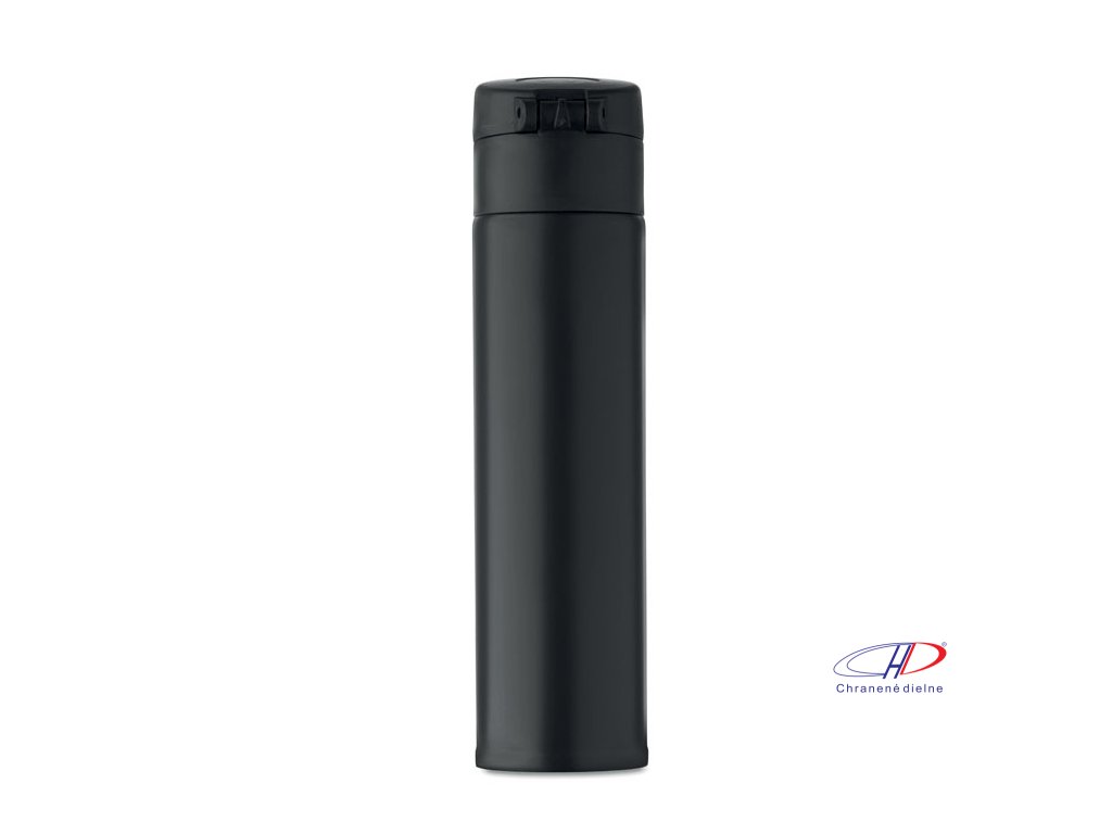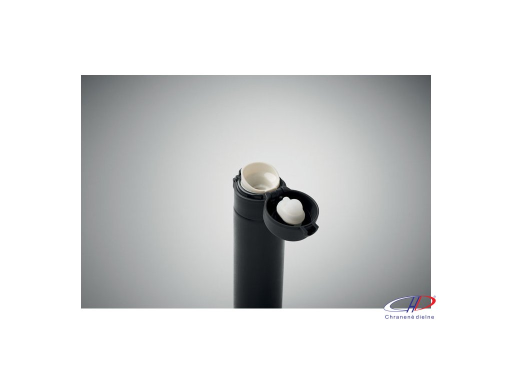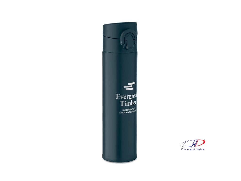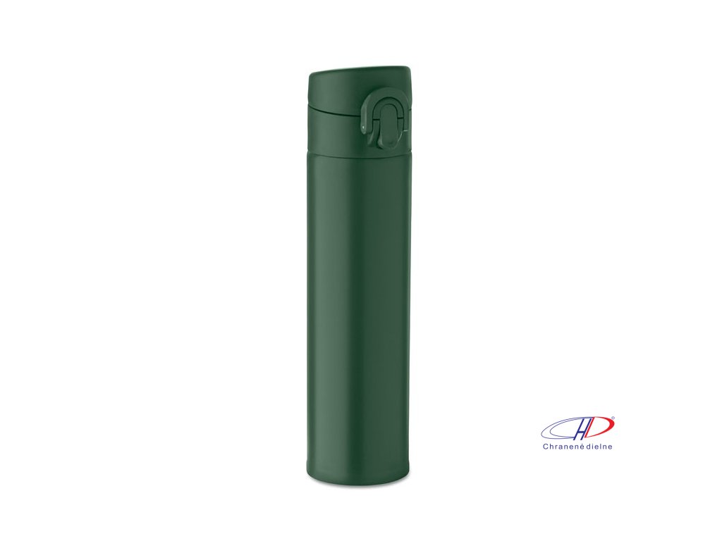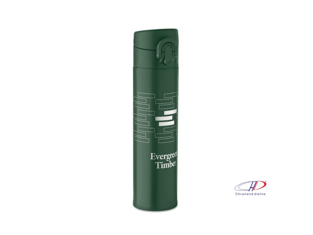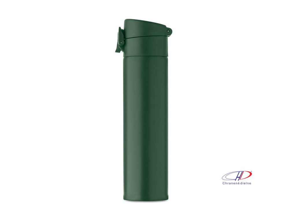 Dvojstenná fľaša na pitie z recyklovanej nehrdzavejúcej ocele (90 % recyklovaná nehrdzavejúca oceľ a 10 % nehrdzavejúca oceľ) s bezpečnostným zámkom na veku a možnosťou otvorenia stlačením. Objem: 300 ml.Dodatočné parametre