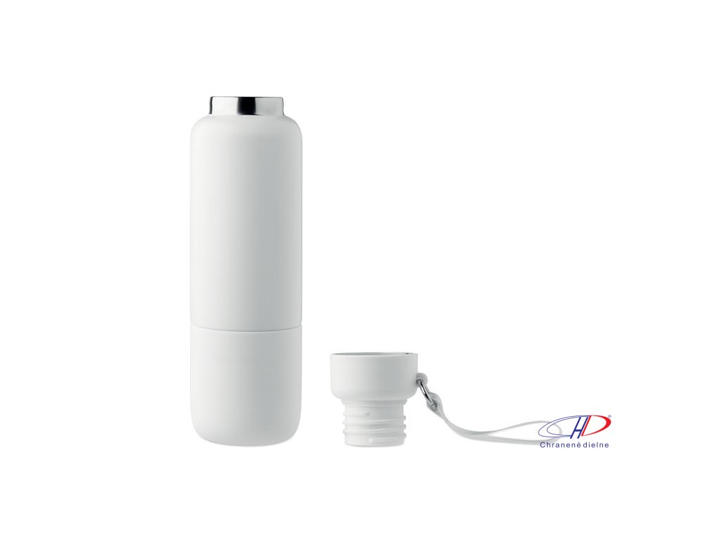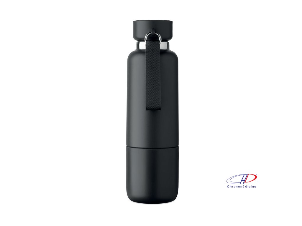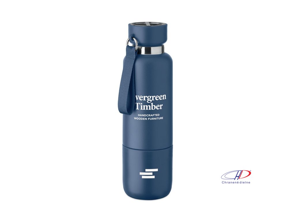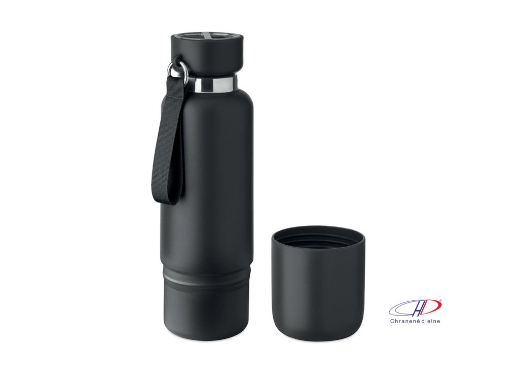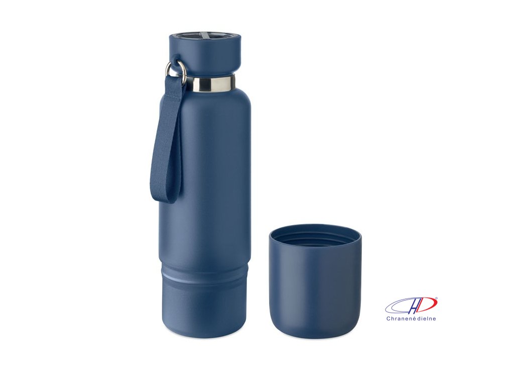 Dvojstenná izolovaná fľaša z 90 % recyklovanej nehrdzavejúcej ocele a 10 % nehrdzavejúcej ocele, s integrovanou rukoväťou a ďalším dlhým popruhom (70 cm) v PP viečku. Nepriepustná. Spodný pohár je súčasťou balenia. Objem: 500 ml.Dodatočné parametre
