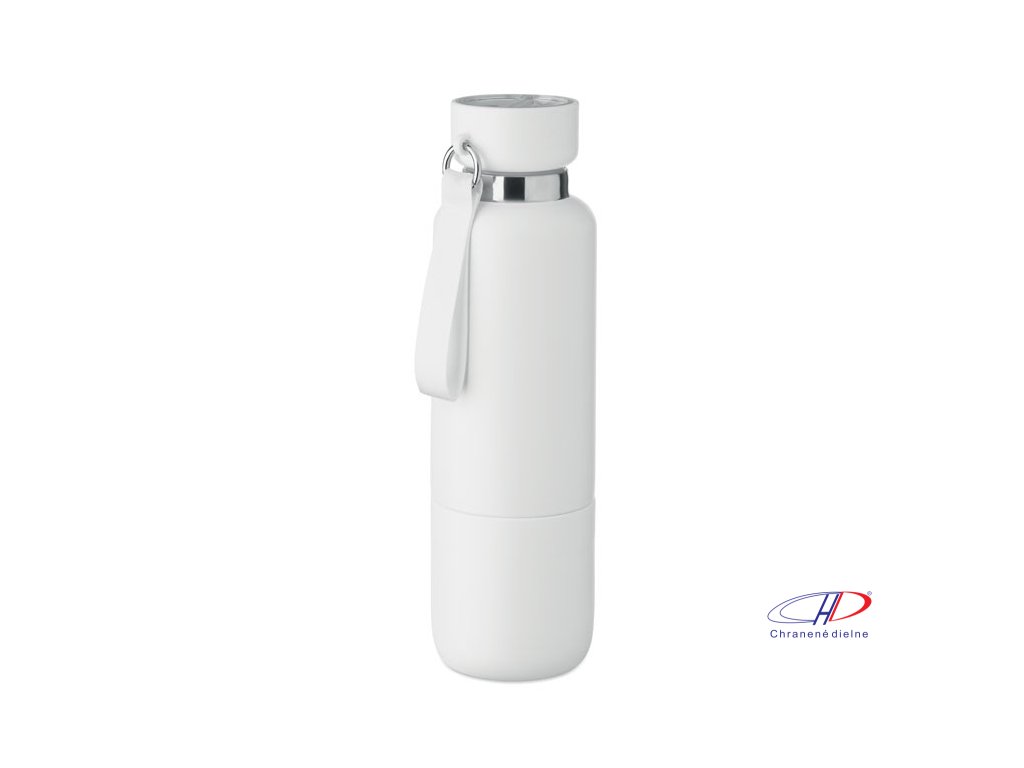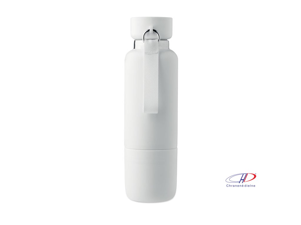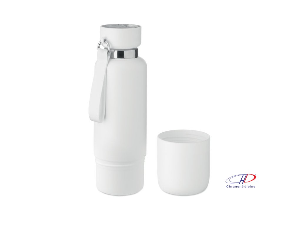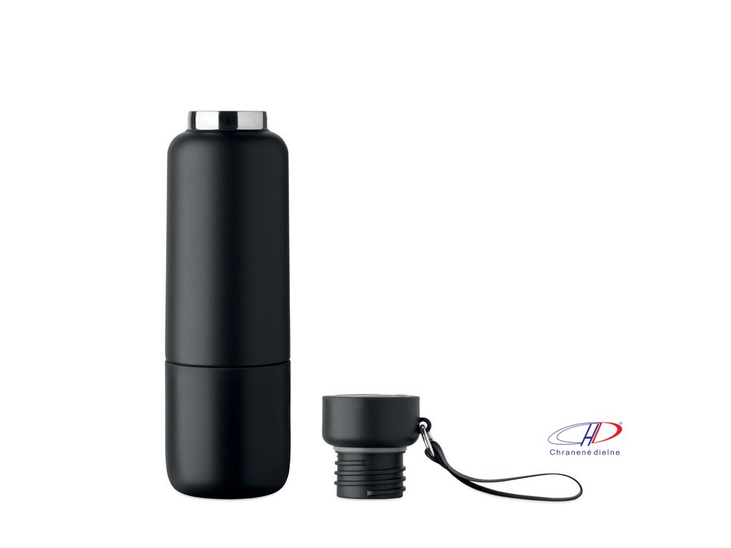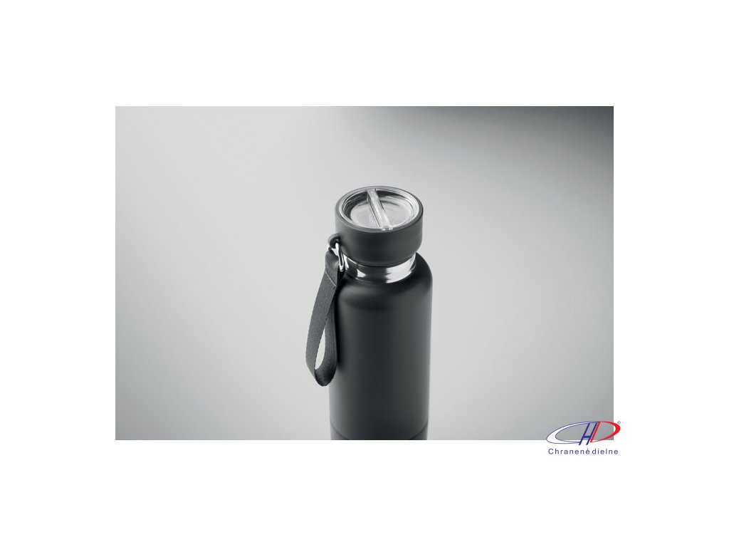 Dvojstenná izolovaná fľaša z 90 % recyklovanej nehrdzavejúcej ocele a 10 % nehrdzavejúcej ocele, s integrovanou rukoväťou a ďalším dlhým popruhom (70 cm) v PP viečku. Nepriepustná. Spodný pohár je súčasťou balenia. Objem: 500 ml.Dodatočné parametre