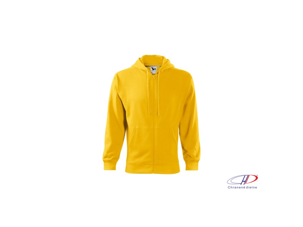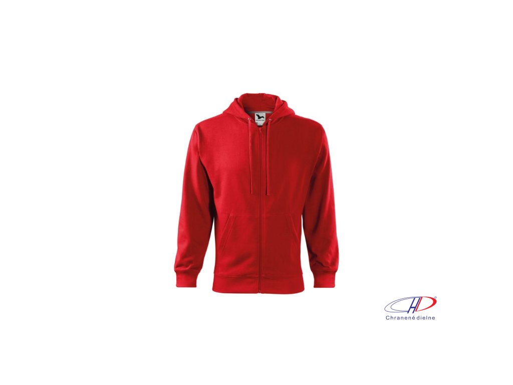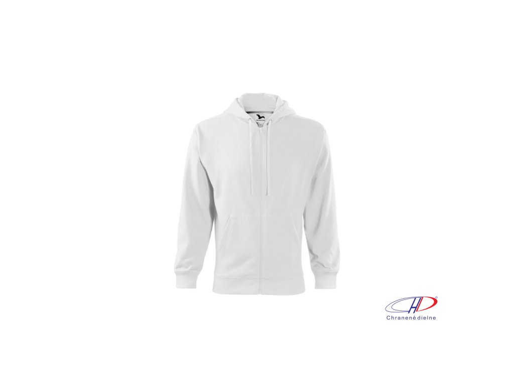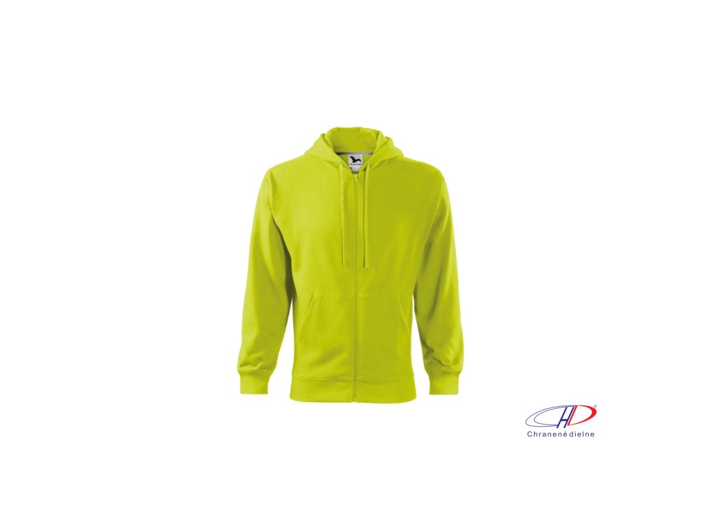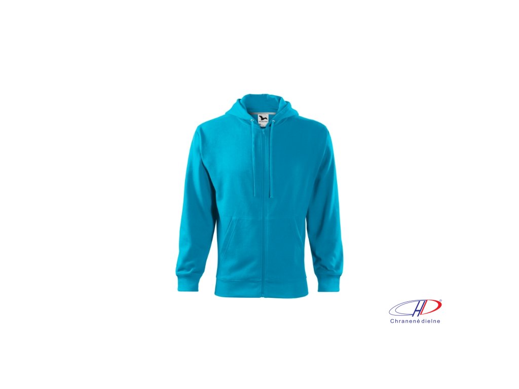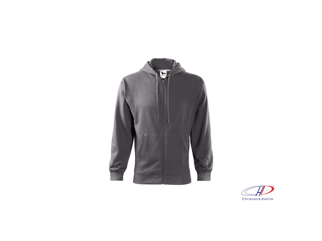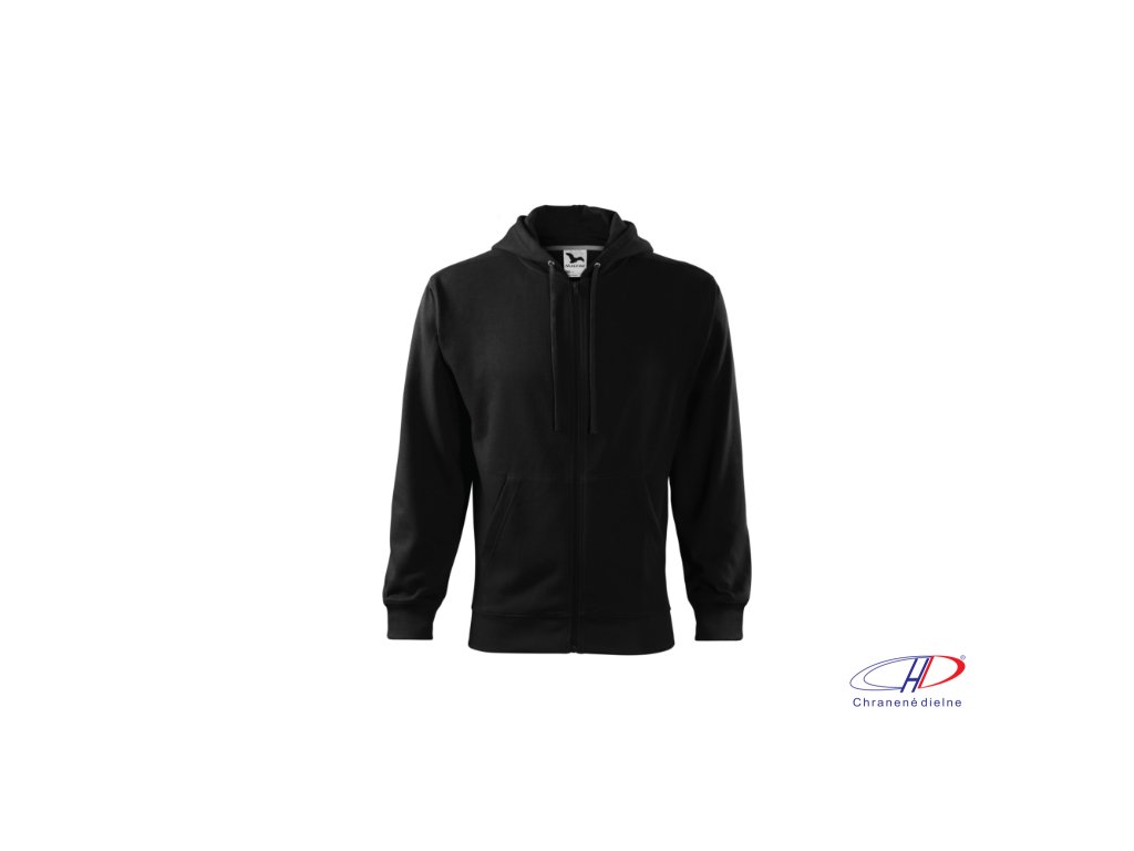 rovný strih s bočnými švami, celozapínací kostený zips, kapucňa s podšívkou, na stiahnutie šnúrkou, vnútorná časť priekrčníka začistená kontrastnou páskou, nakladané vrecká v štýle klokanky, dolný lem a manžety rukávov z rebrového úpletu 2:2 s 5 % elastanu, vnútorná strana počesaná