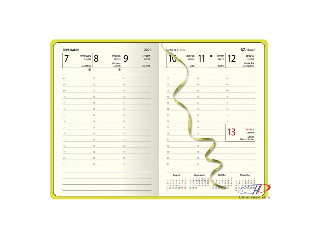 Štýlový týždenný diár v pestrej farbe s prehľadným kalendáriom na celý týždeň. Diár má praktickú flexi väzbu. Stredom diára je gumička prichytená o kovový úchyt. Kalendárium: SK. Rozsah: 192 listov.Dodatočné parametre