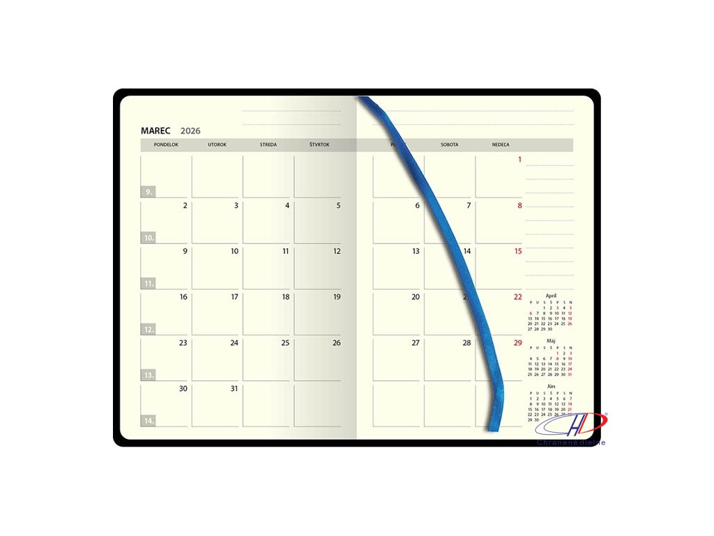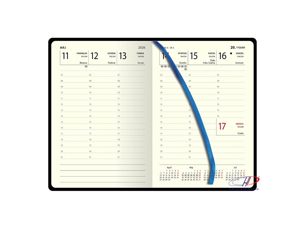 Týždenný stĺpcový diár s pútkom a vloženým perom, gumičkou na uzatváranie a praktickým vreckom. Diár je v pevnej väzbe z ekologickej kože a s razbou roka. Kalendárium: SK. Rozsah: 192 listov.Dodatočné parametre