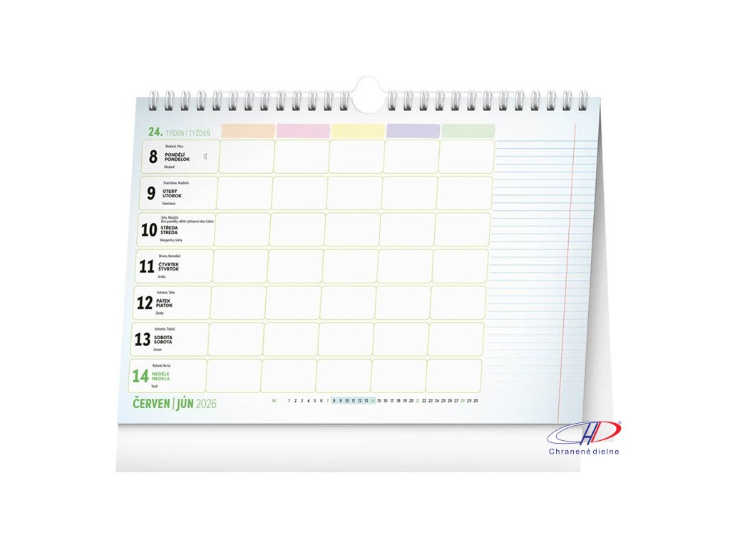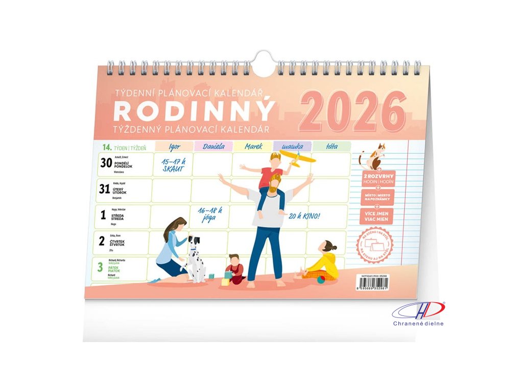 MINIMÁLNY ODBER 3 kusy. Väzba: dvojitá špirála. Kalendárium: CZ/SK. 30 listov (obojstranná tlač). Týždenný rodinný kalendár, v ktorom si čas naplánuje až päťčlenná rodina. Kalendár môžete použiť ako stolný alebo ho pomocou háčika zavesiť na stenuDodatočné parametre