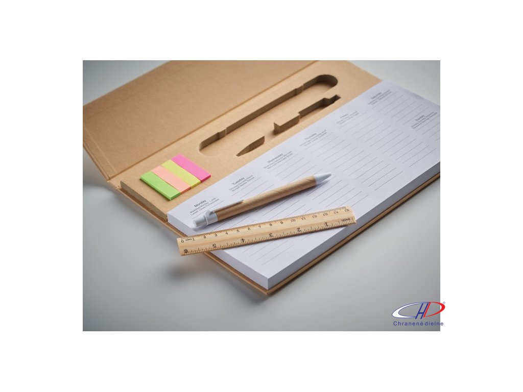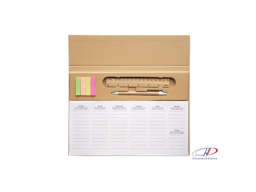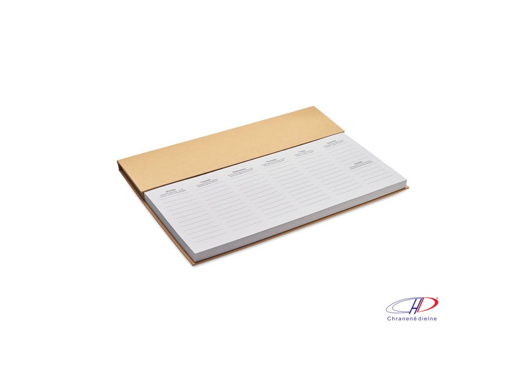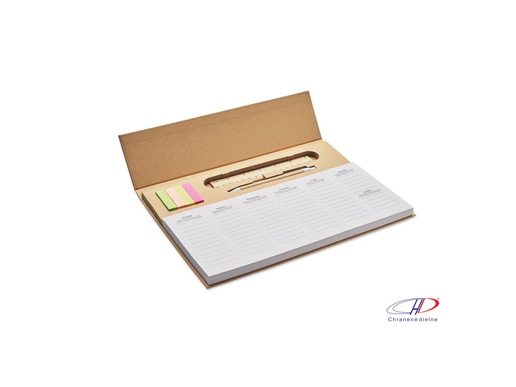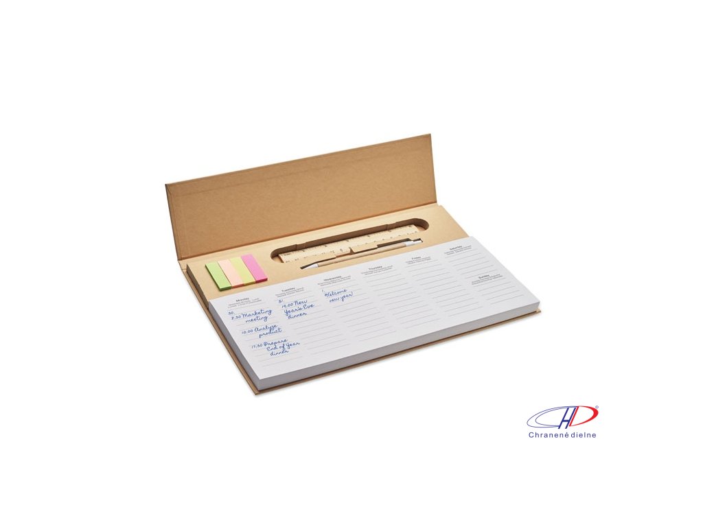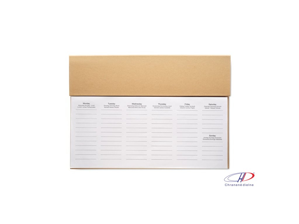 125-stranový týždenný stolový plánovač v 6 jazykoch (EN/DE/FR/ES/IT/NL/PL) s obalom zo sulfátového papiera, guľôčkovým perom s modrou náplňou, dreveným pravítkom a poznámkovým blokom.Dodatočné parametre