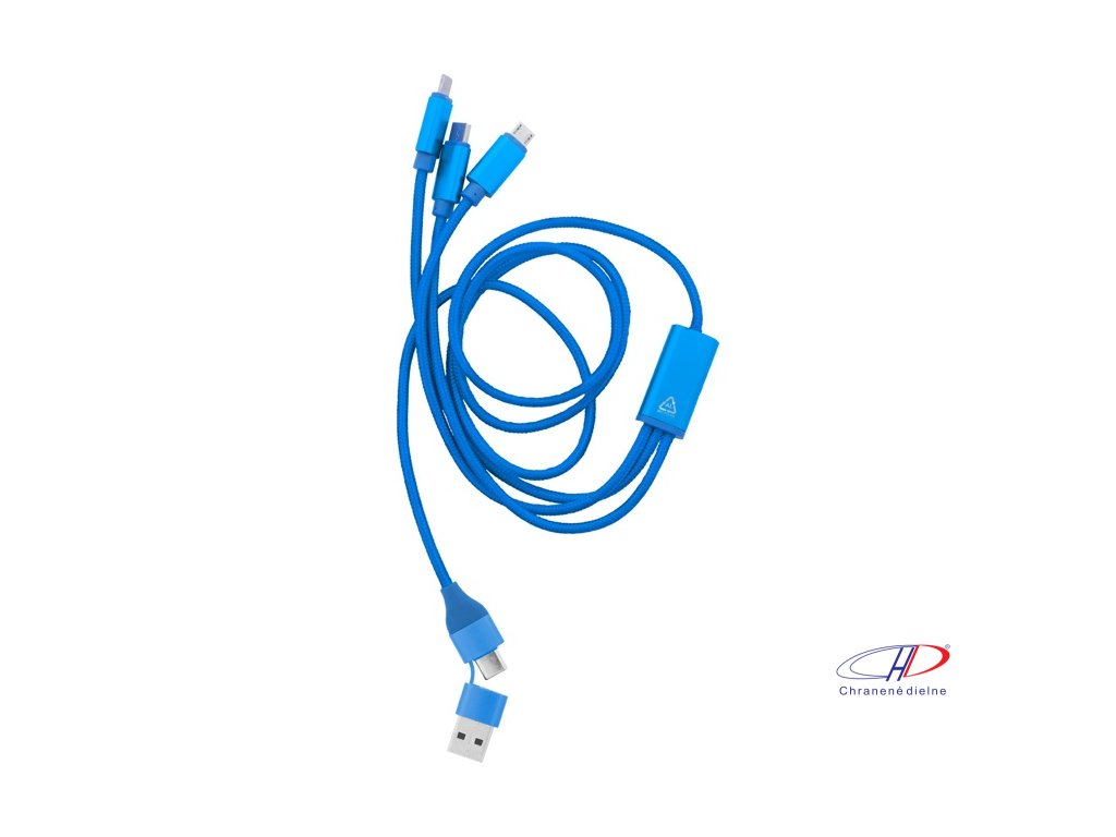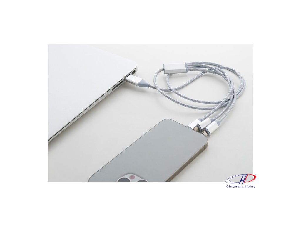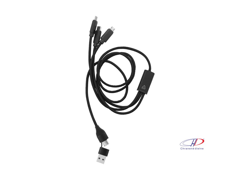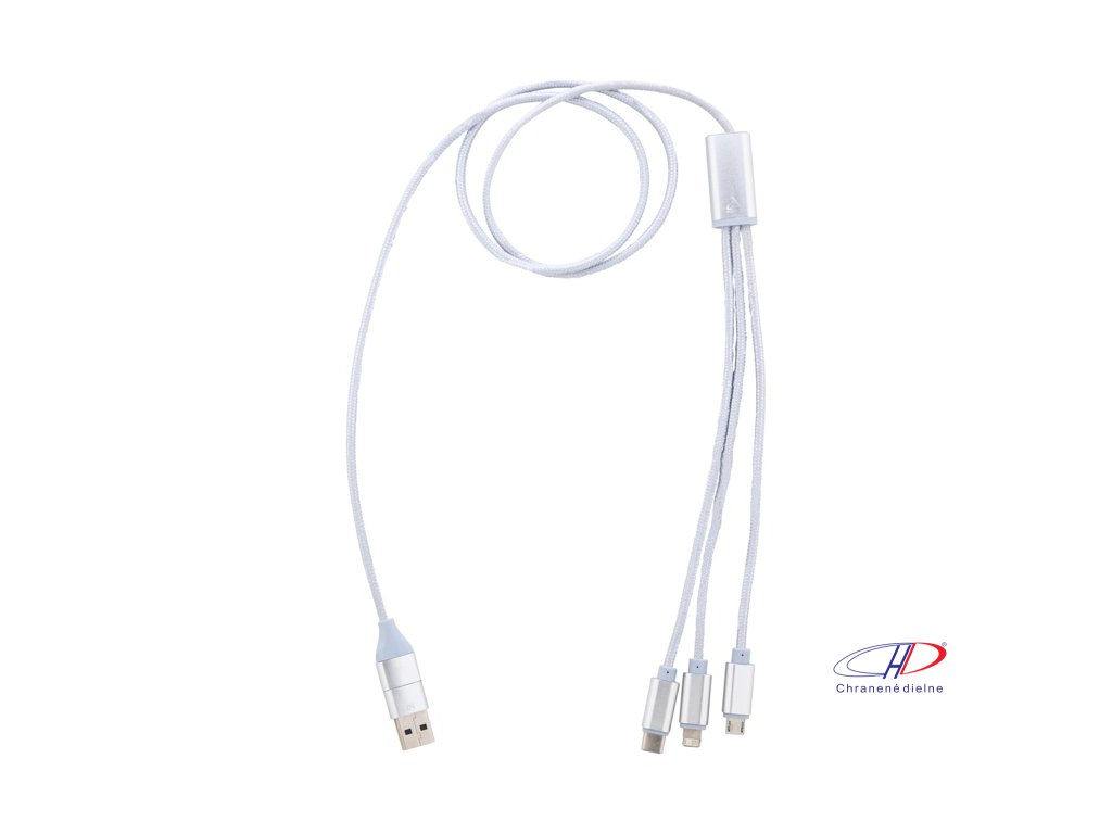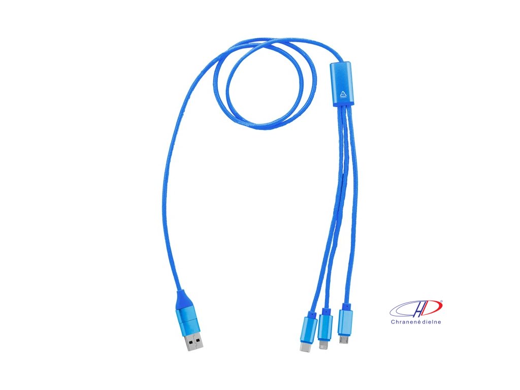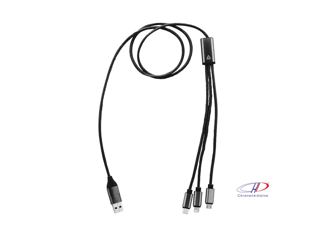 USB nabíjací kábel z recyklovaného hliníka a RPET s konektormi micro USB, USB-C a Lightning. So vstupmi USB a USB-C. Dĺžka kábla: 100 cm.Dodatočné parametre