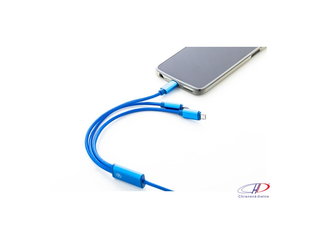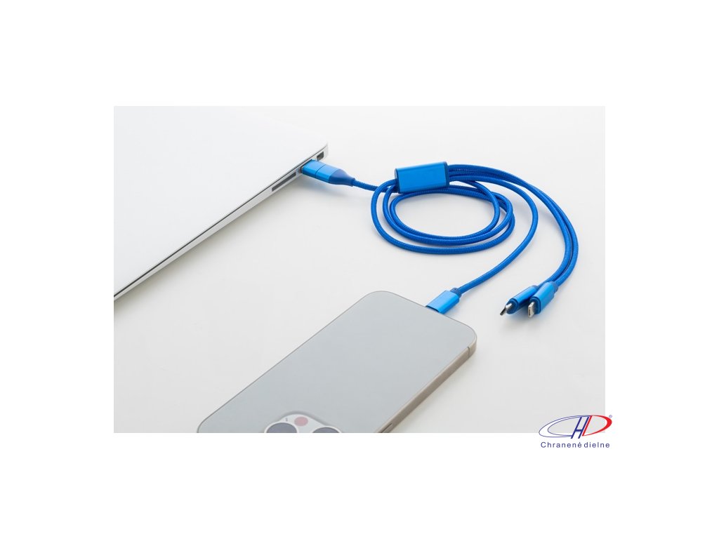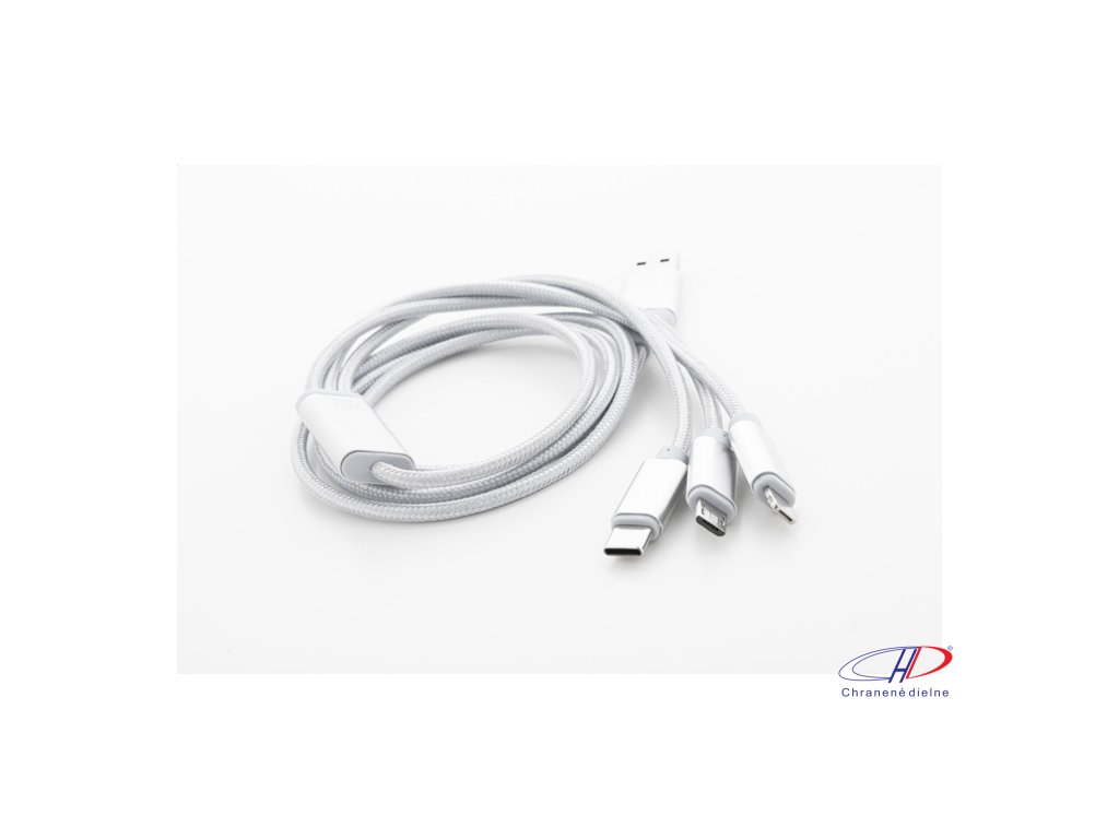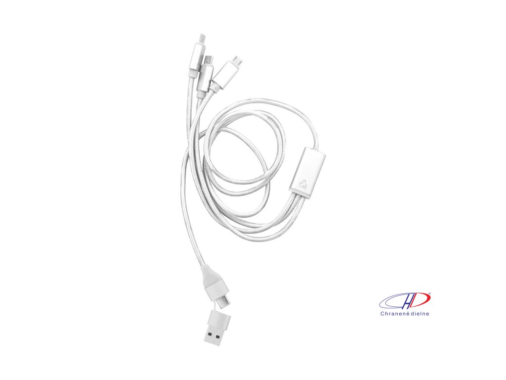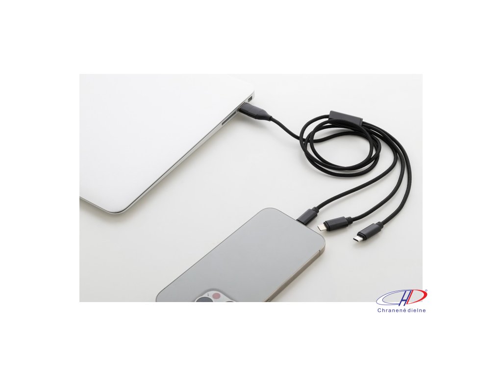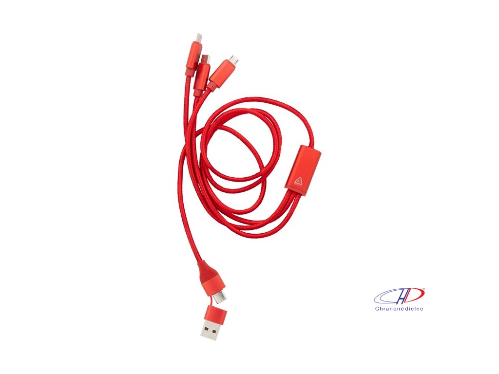 USB nabíjací kábel z recyklovaného hliníka a RPET s konektormi micro USB, USB-C a Lightning. So vstupmi USB a USB-C. Dĺžka kábla: 100 cm.Dodatočné parametre