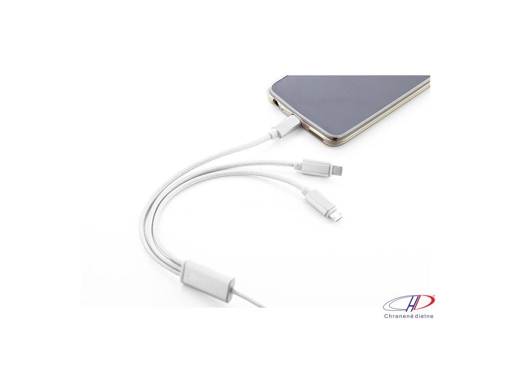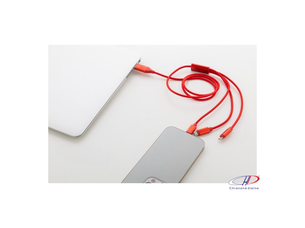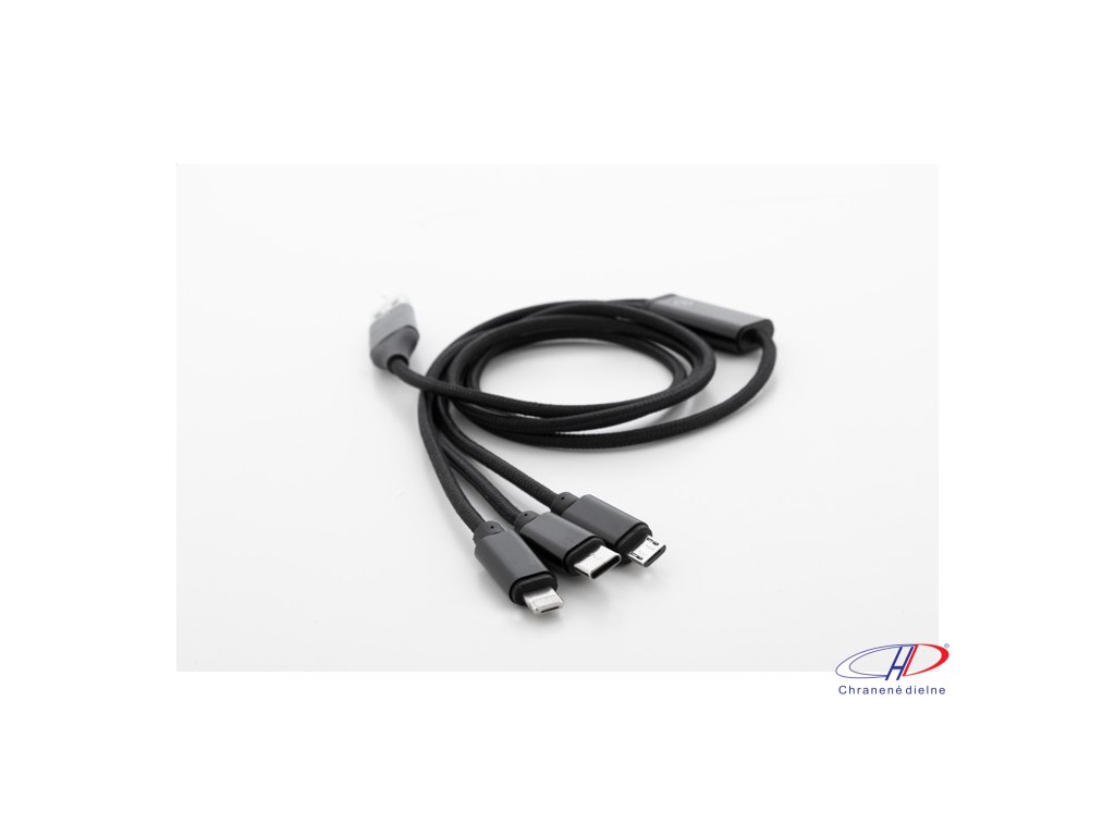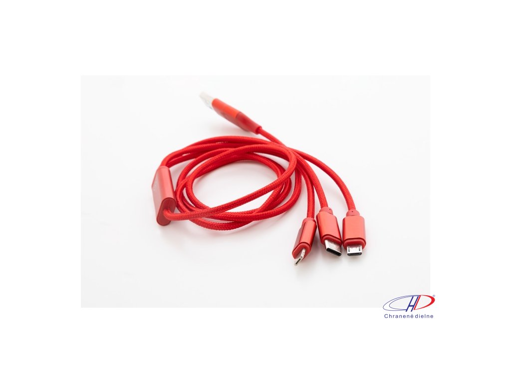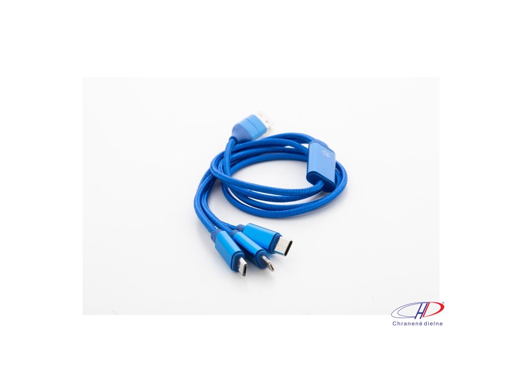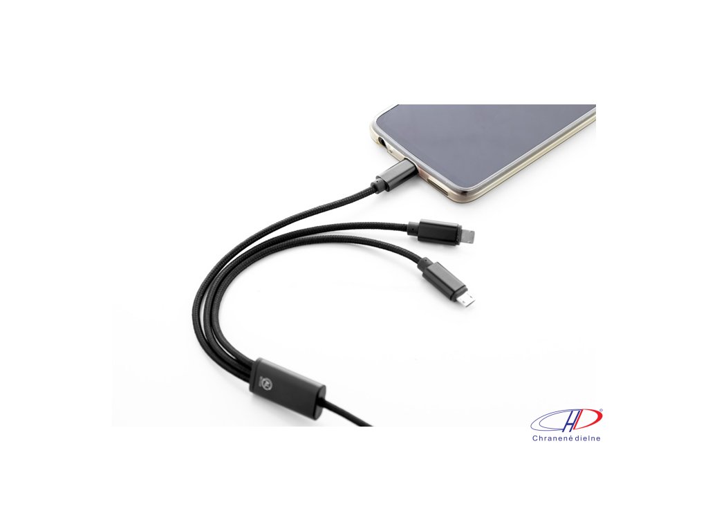 USB nabíjací kábel z recyklovaného hliníka a RPET s konektormi micro USB, USB-C a Lightning. So vstupmi USB a USB-C. Dĺžka kábla: 100 cm.Dodatočné parametre