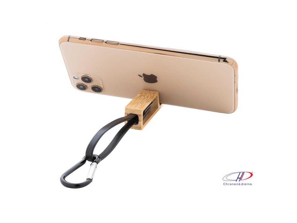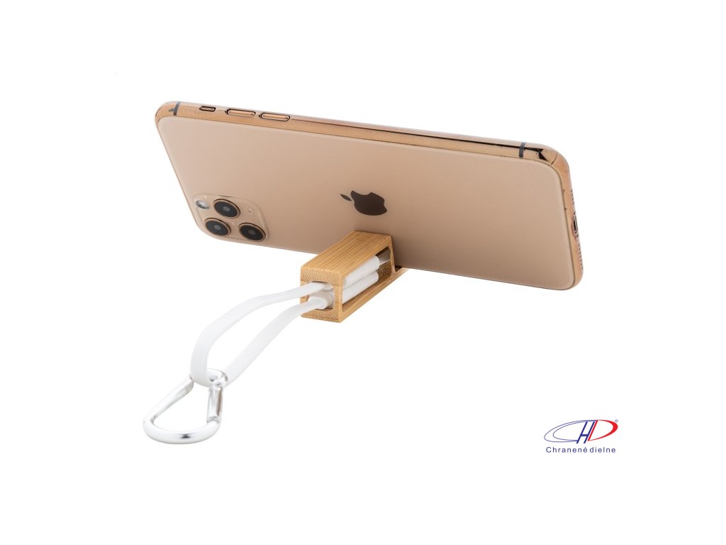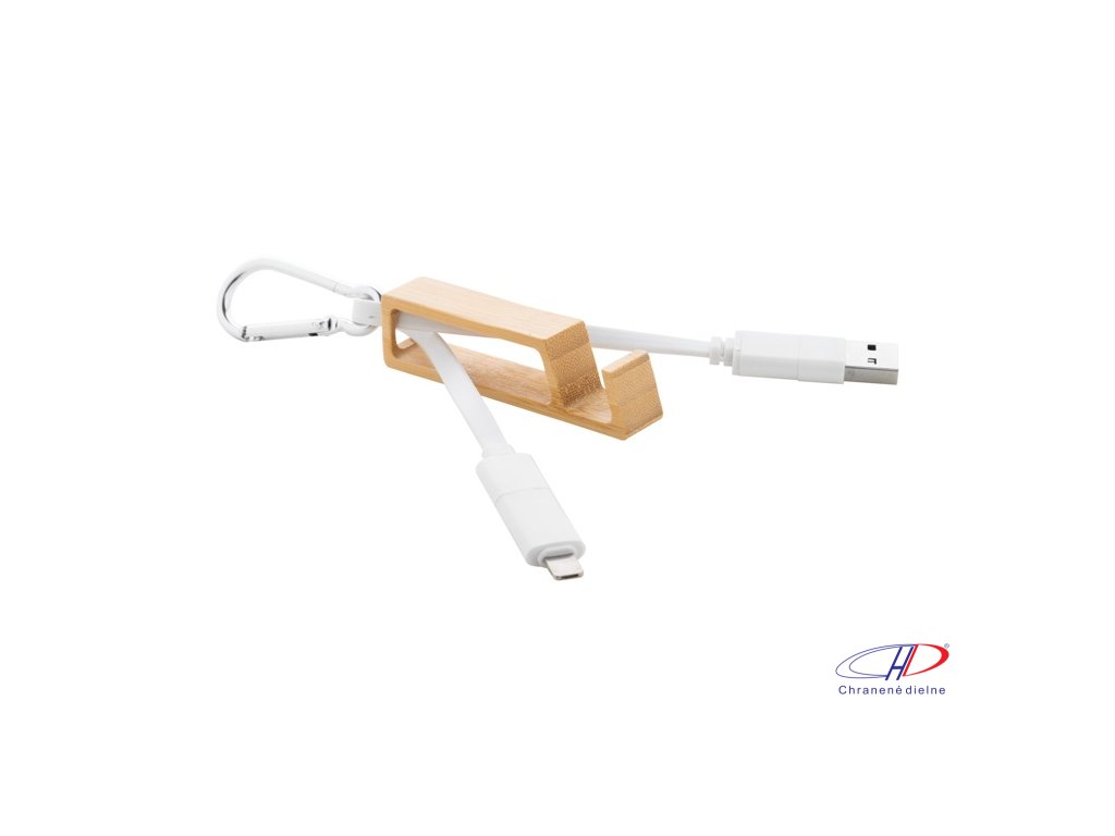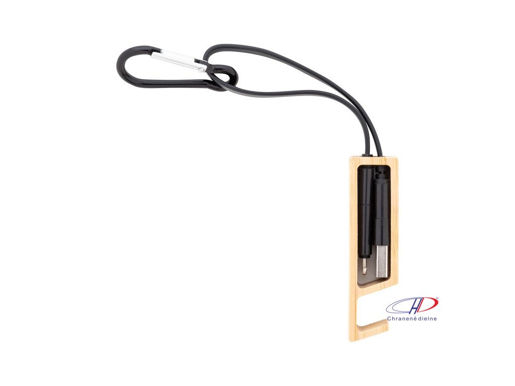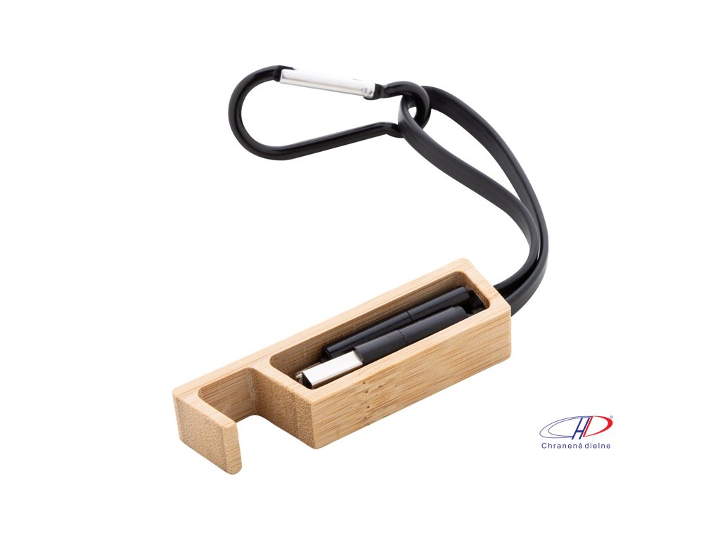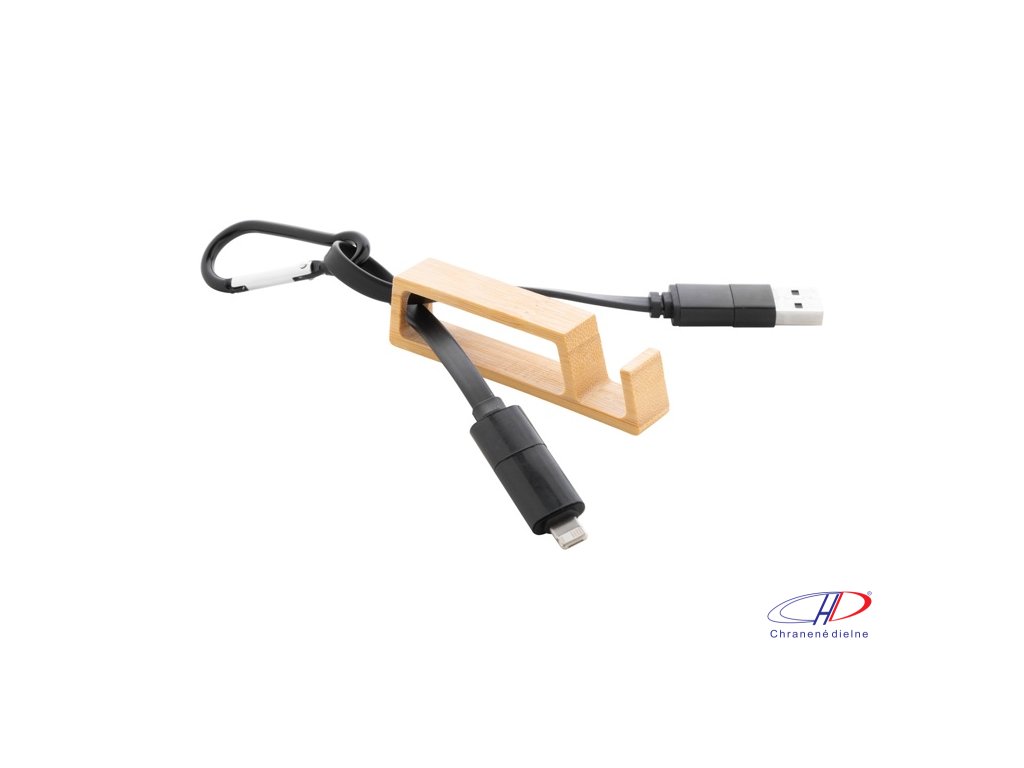 USB nabíjací kábel s karabínou z recyklovaného hliníka a bambusovým držiakom na mobil. S konektormi micro USB, USB-C a Lightning. So vstupmi USB a USB-C.Dodatočné parametre