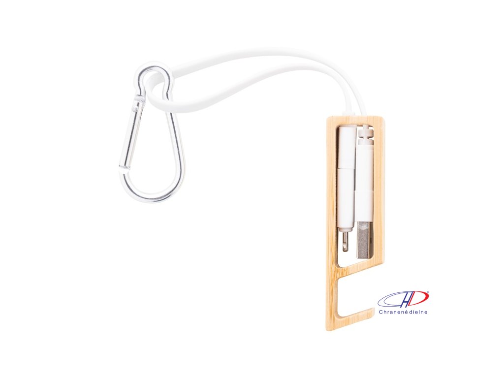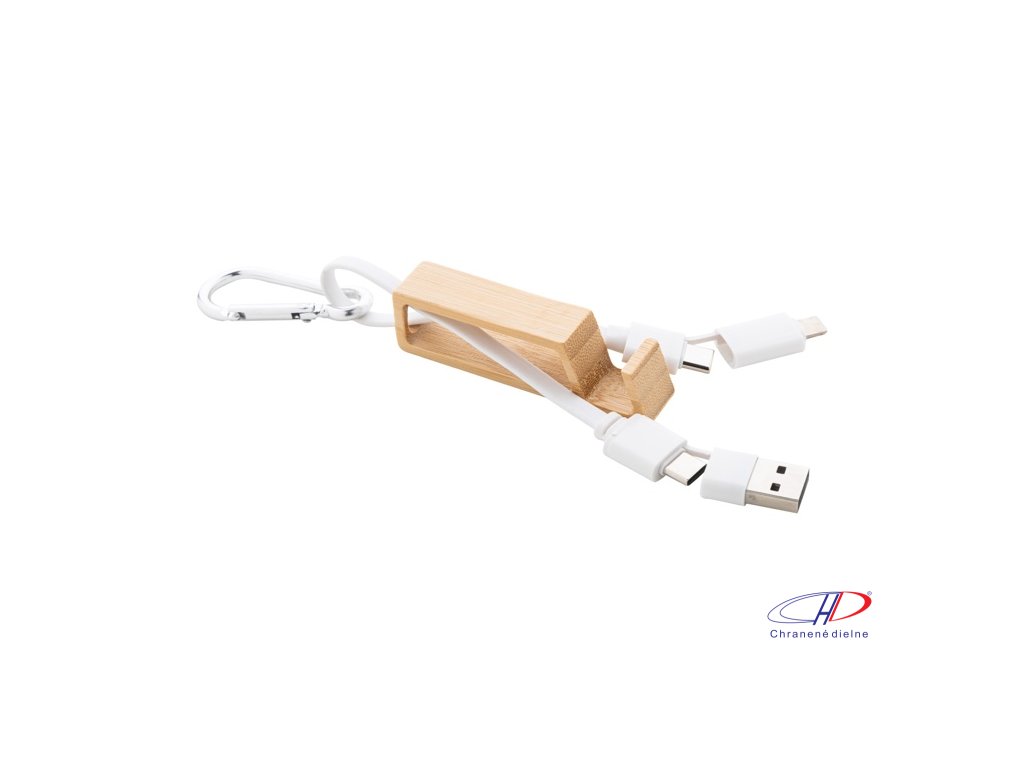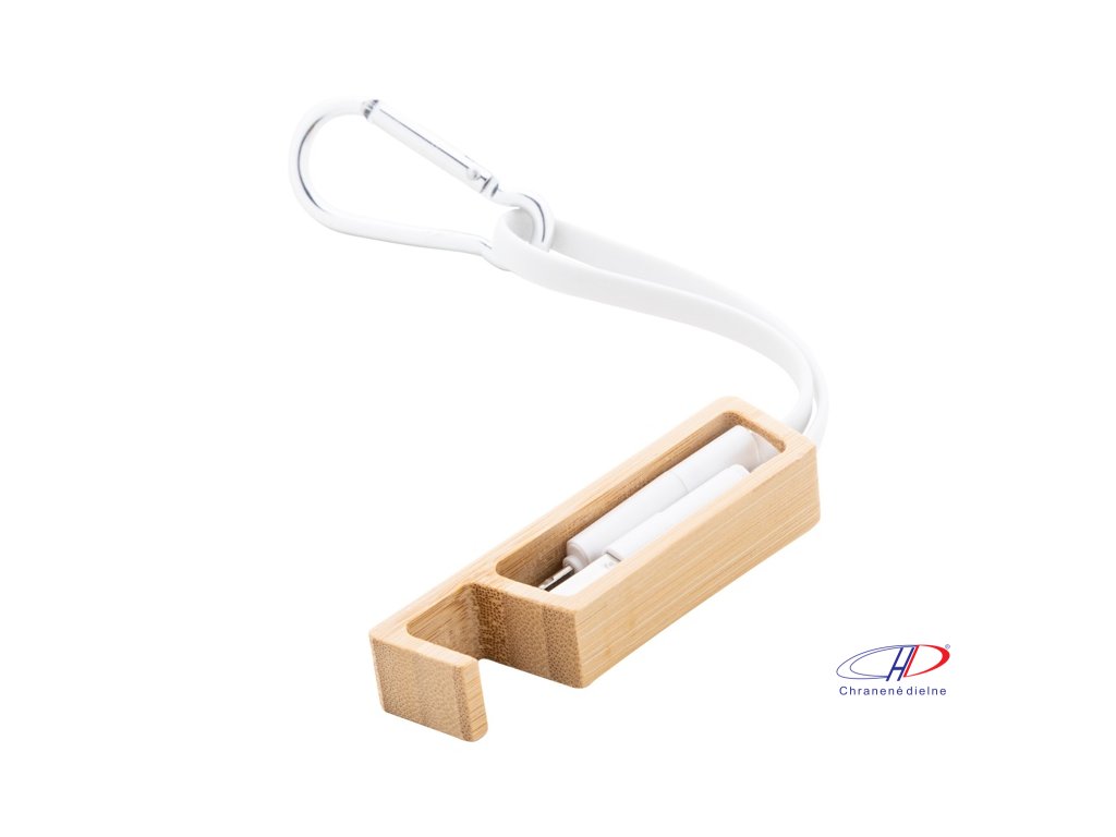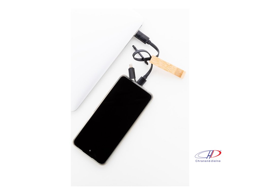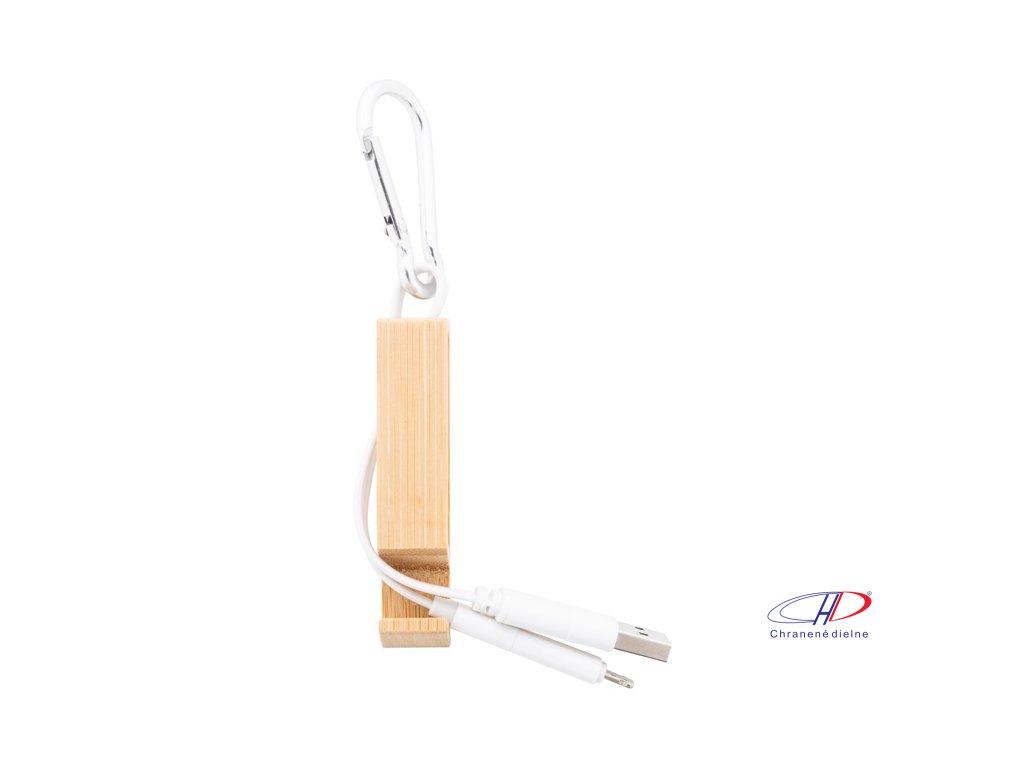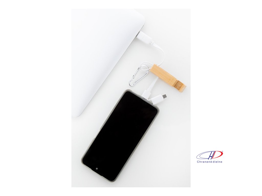 USB nabíjací kábel s karabínou z recyklovaného hliníka a bambusovým držiakom na mobil. S konektormi micro USB, USB-C a Lightning. So vstupmi USB a USB-C.Dodatočné parametre