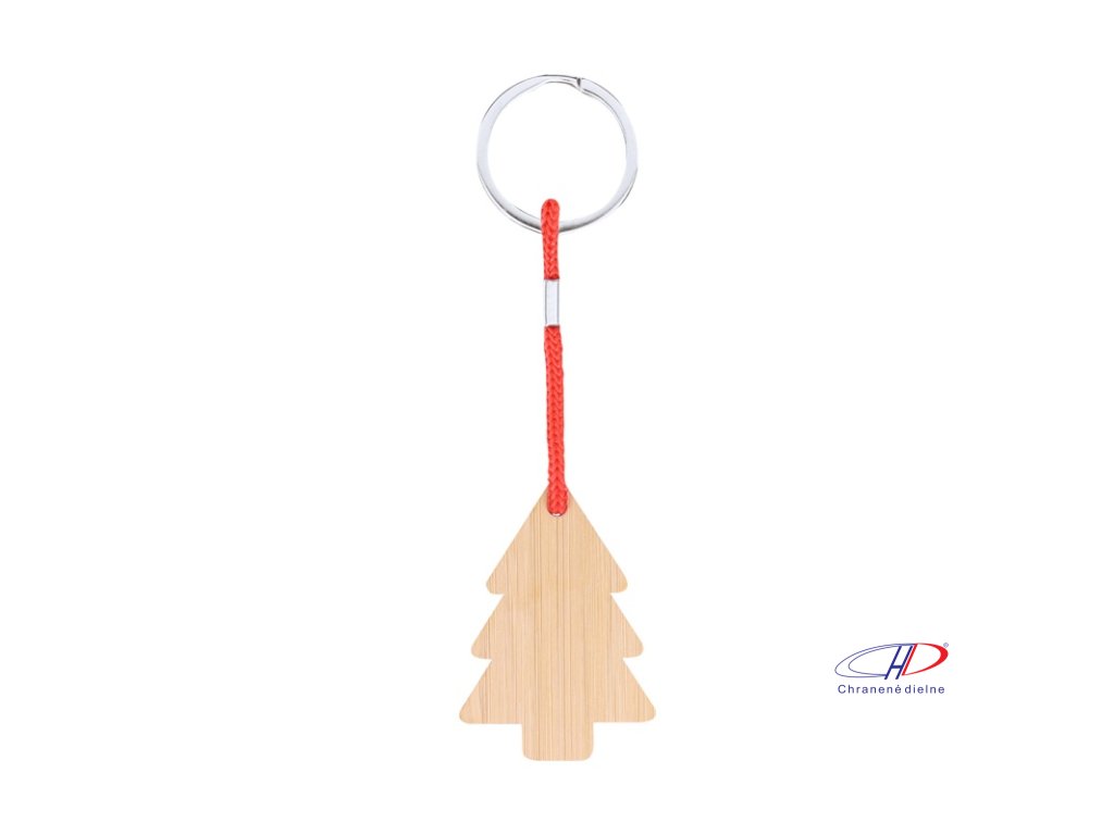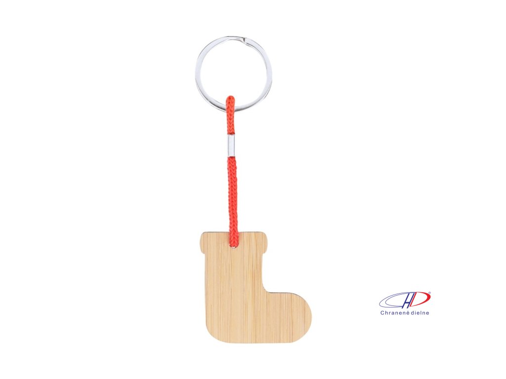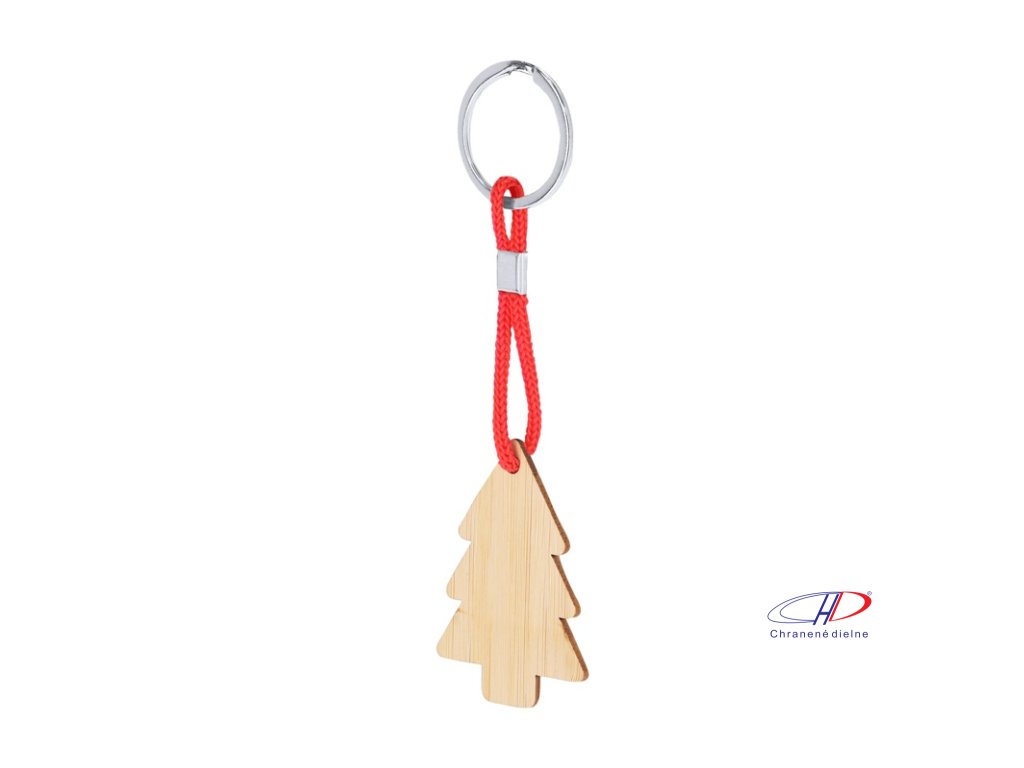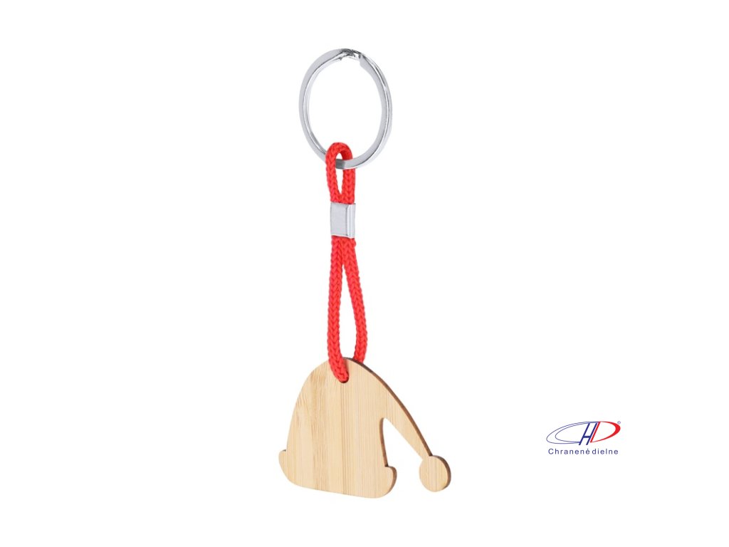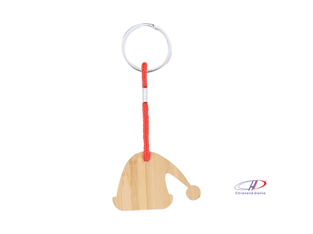 Vianočný prívesok na kľúče z bambusovej preglejky s červeným povrázkom a kovovým krúžkom.