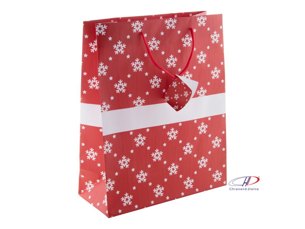 Matná laminovaná papierová darčeková taška s vianočným dizajnom, bielou tlačovou plochou a visačkou.Dodatočné parametre