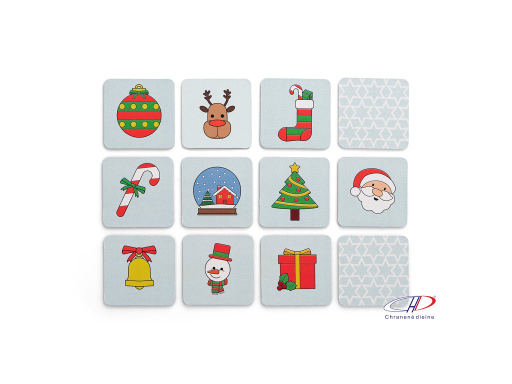 Pexeso s vianočnými obrázkami. Krabička môže byť využitá na uloženie hry.
