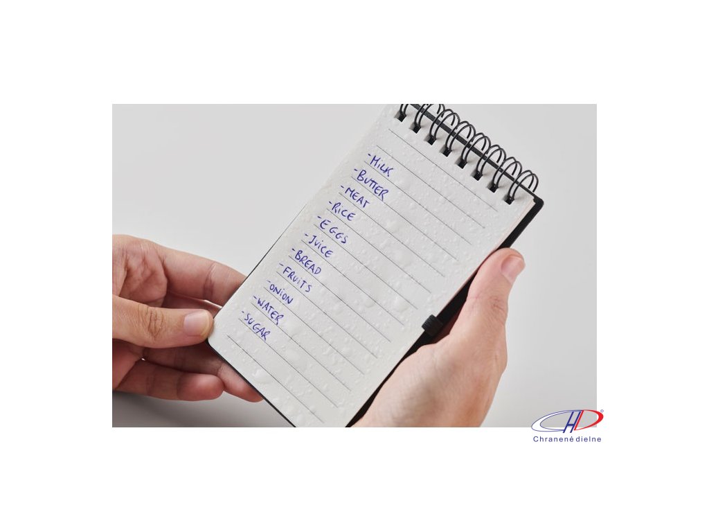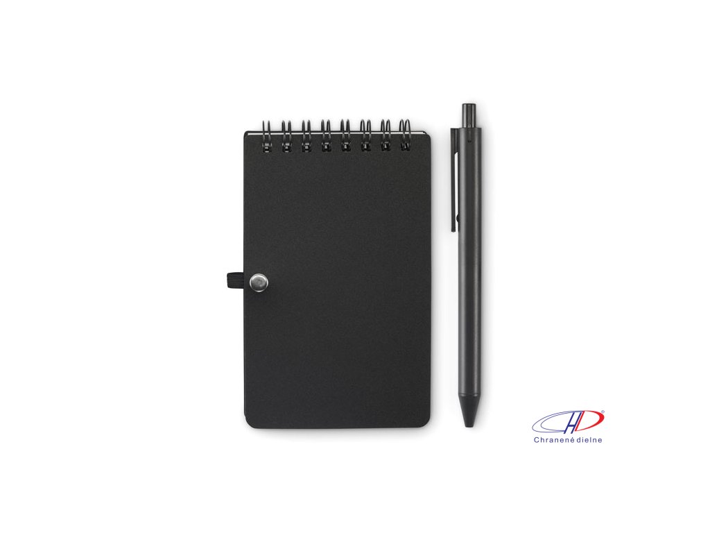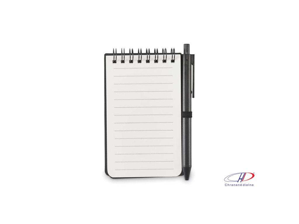 Vodoodpudivý poznámkový blok v PP obale s perom. Dvojitý drôt. Minerálny papier 120 g/m2, 50 linajkových listov. Modrý atrament. Elastické zapínanie a držiak na pero.Dodatočné parametre