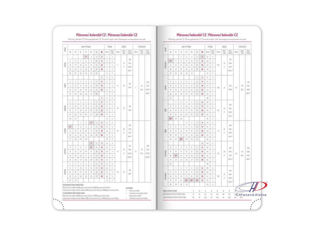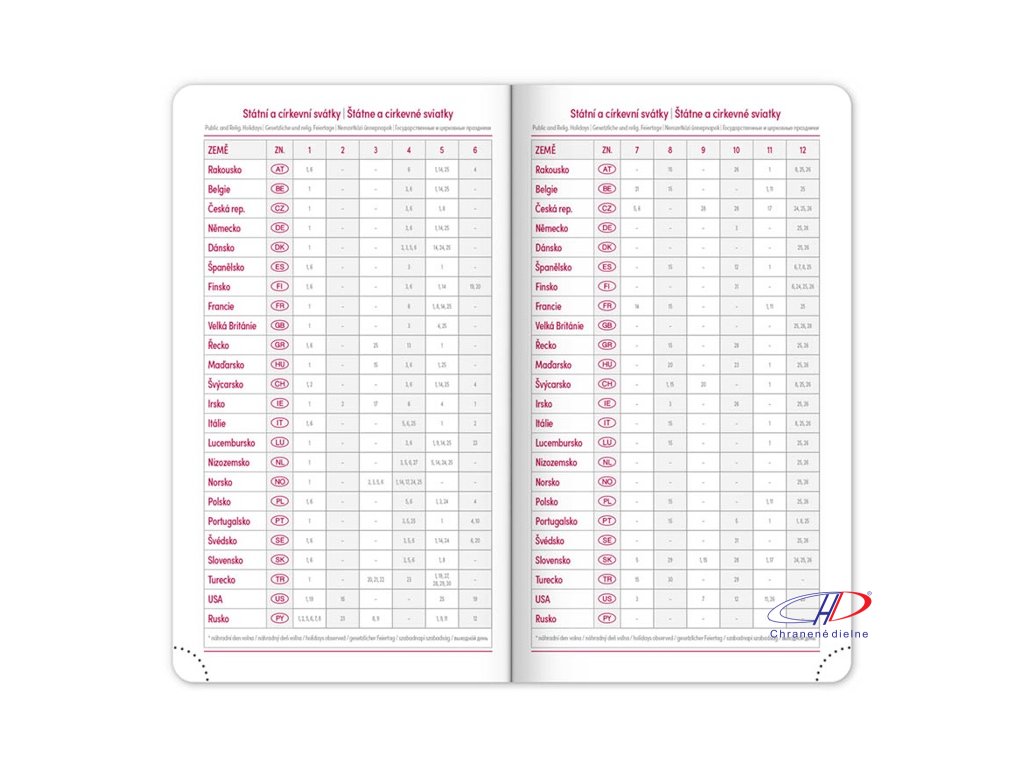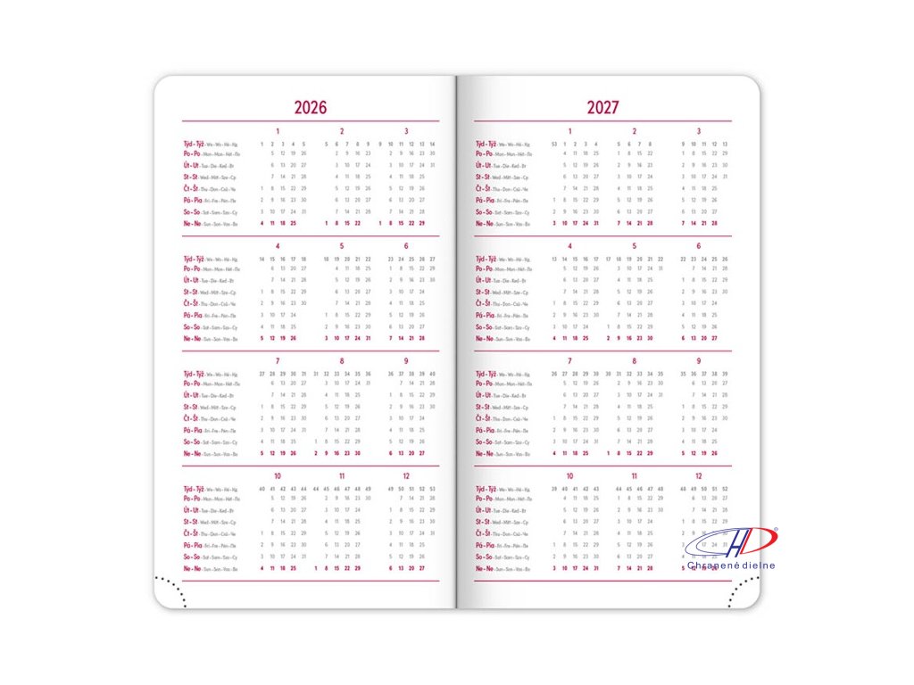 MINIMÁLNY ODBER 3 kusy. Väzba: tuhá knižná. Kalendárium: CZ/SK/GB/DE/HU/RU. Ročný plánovací kalendár 2026–2027, pracovný kalendár, sviatky, osobné údaje, perforované rožky, priestor pre poznámkyDodatočné parametre