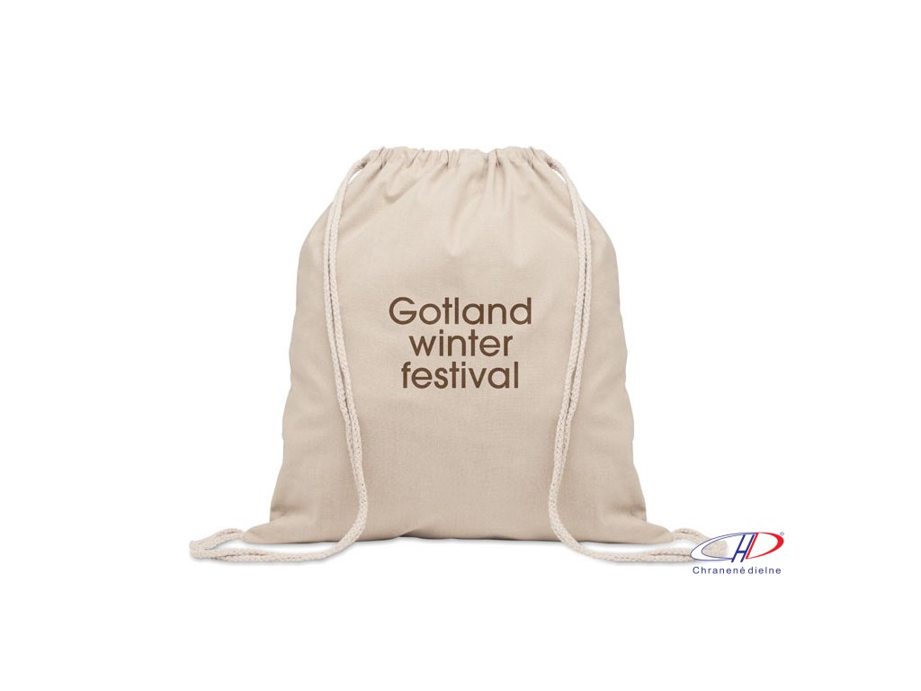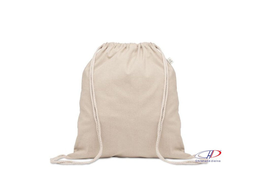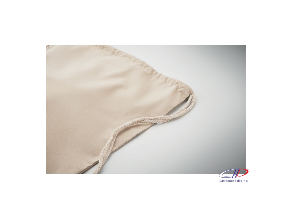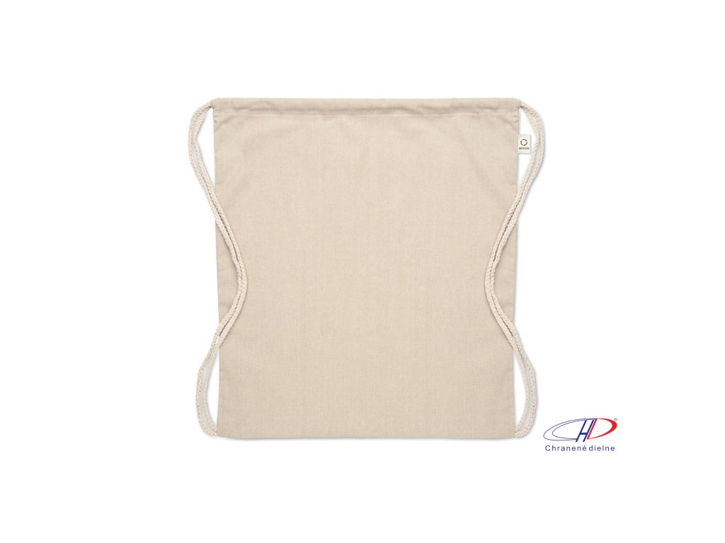 Sťahovacie vrecúško z recyklovanej predspotrebiteľskej bavlny (70%) a RPET (30%). Gramáž 140 g/m2. Táto položka sa môže po potlači zmenšiť.Dodatočné parametre