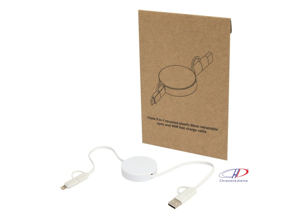 40W samonavíjací dátový synchronizačný kábel 5v1. Vstupný konektor USB-A a USB-C, výstupný USB-C a Lightning/Micro USB. USB-C na USB-C výkon max 40W, USB-A na USB-C max 18W a ďalšie pripojenia max 15W. Kompatibilný s CarPlay and Android Auto. Dĺžka: 90 cm.Dodatočné parametre