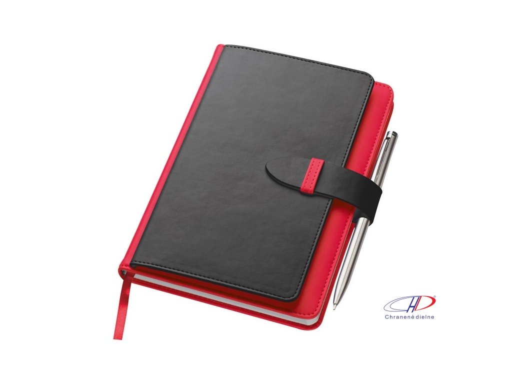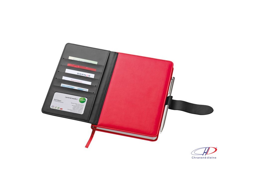 Zápisník A5 z PU s 256 linajkovanými stranami 128 listov, obsahuje držiak na pero a priestor na 6 vizitiek.