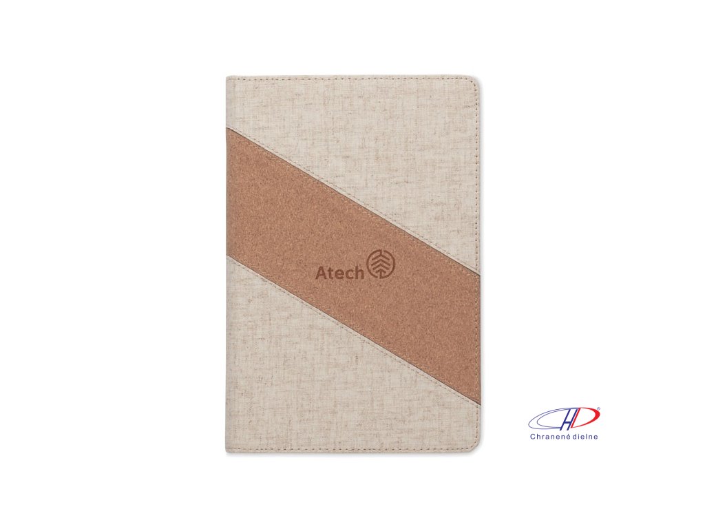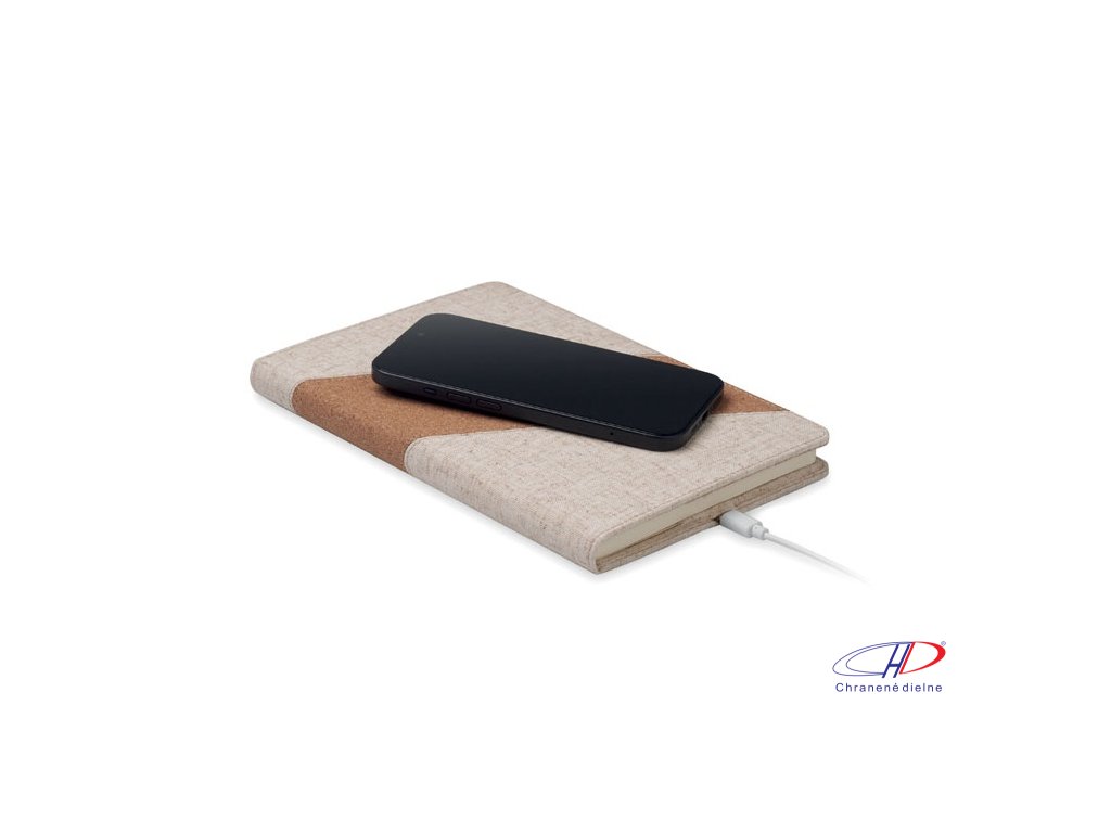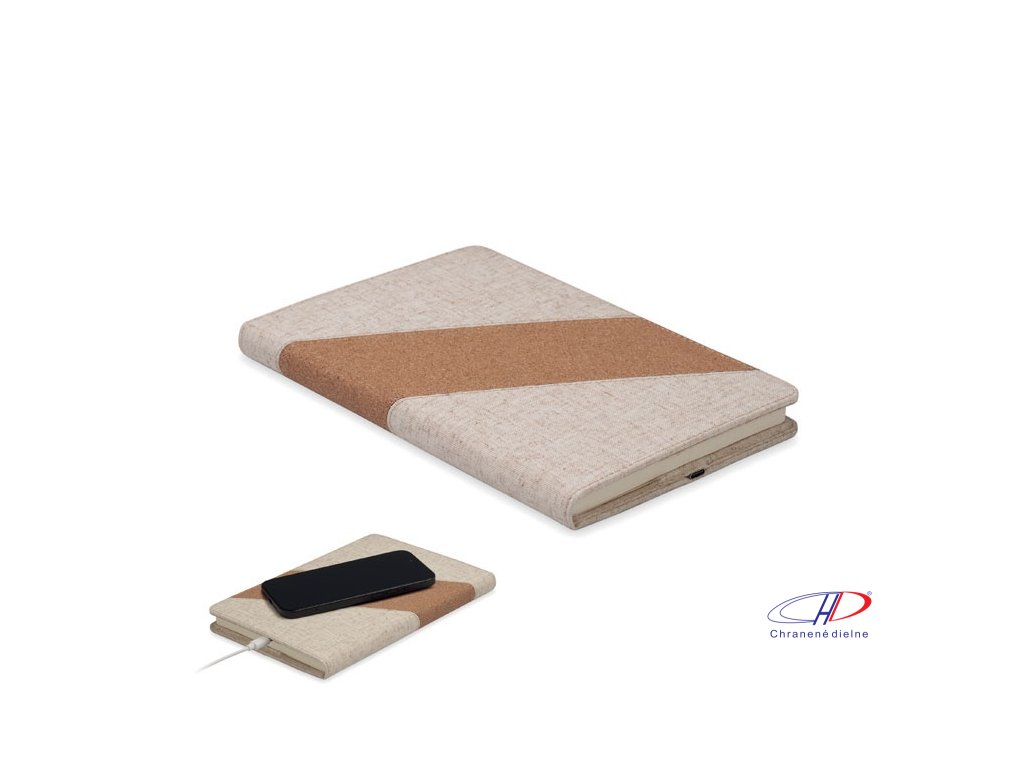 Zápisník A5 s integrovanou bezdrôtovou nabíjačkou 15W. S bavlnenými a korkovými detailmi na obálke, 128 linajkových listov (64 listov). Záložka so stuhou.Dodatočné parametre