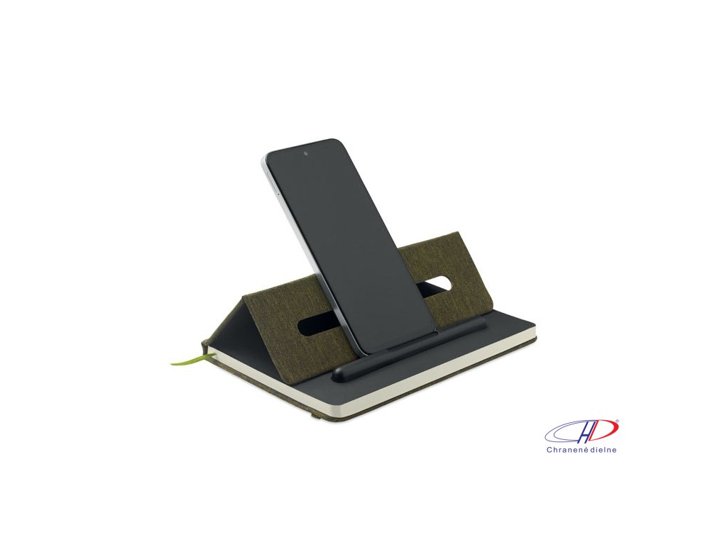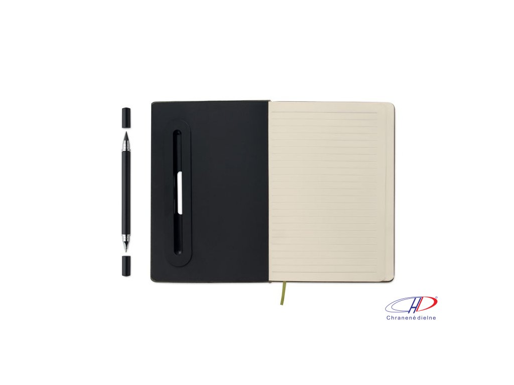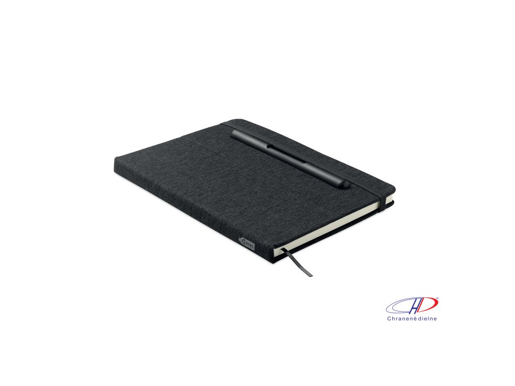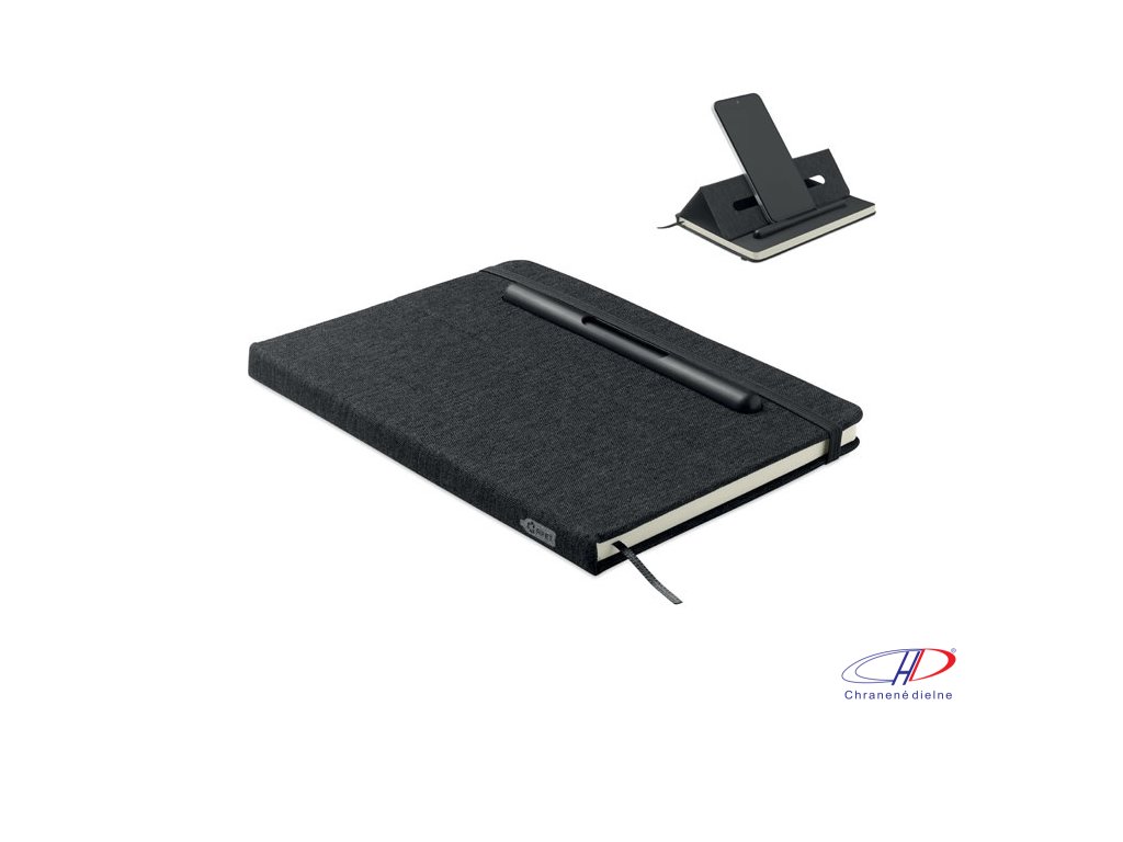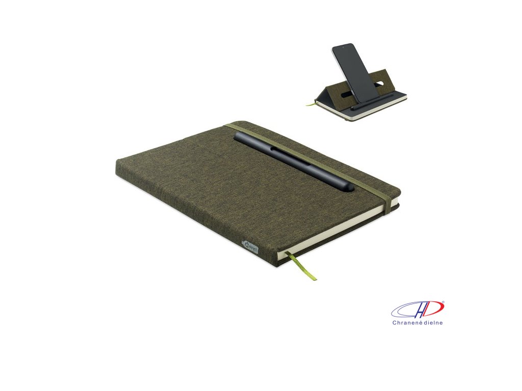 Zápisník A5 s tvrdým obalom z RPET s funkciou držiaka na telefón. Integrované 2-v-1 guľôčkové pero bez atramentu a bežné guľôčkové pero z ABS materiálu. Pevný obal. 192 linajkových strán z recyklovaného papiera (96 listov). Pútko a záložka.Dodatočné parametre