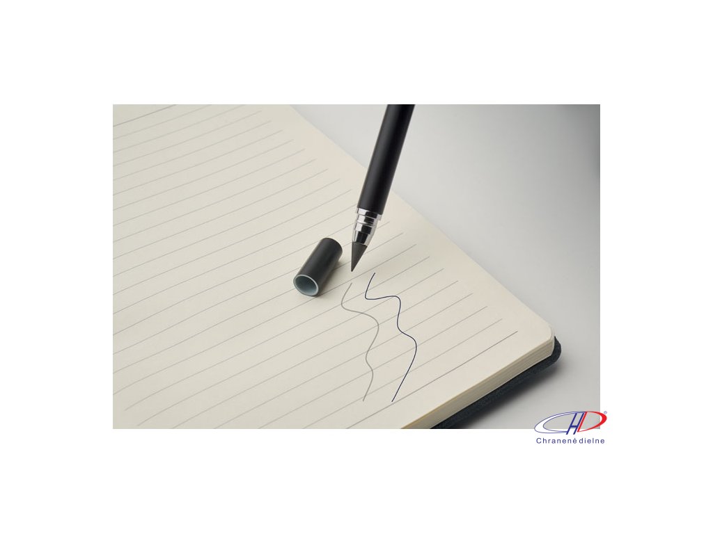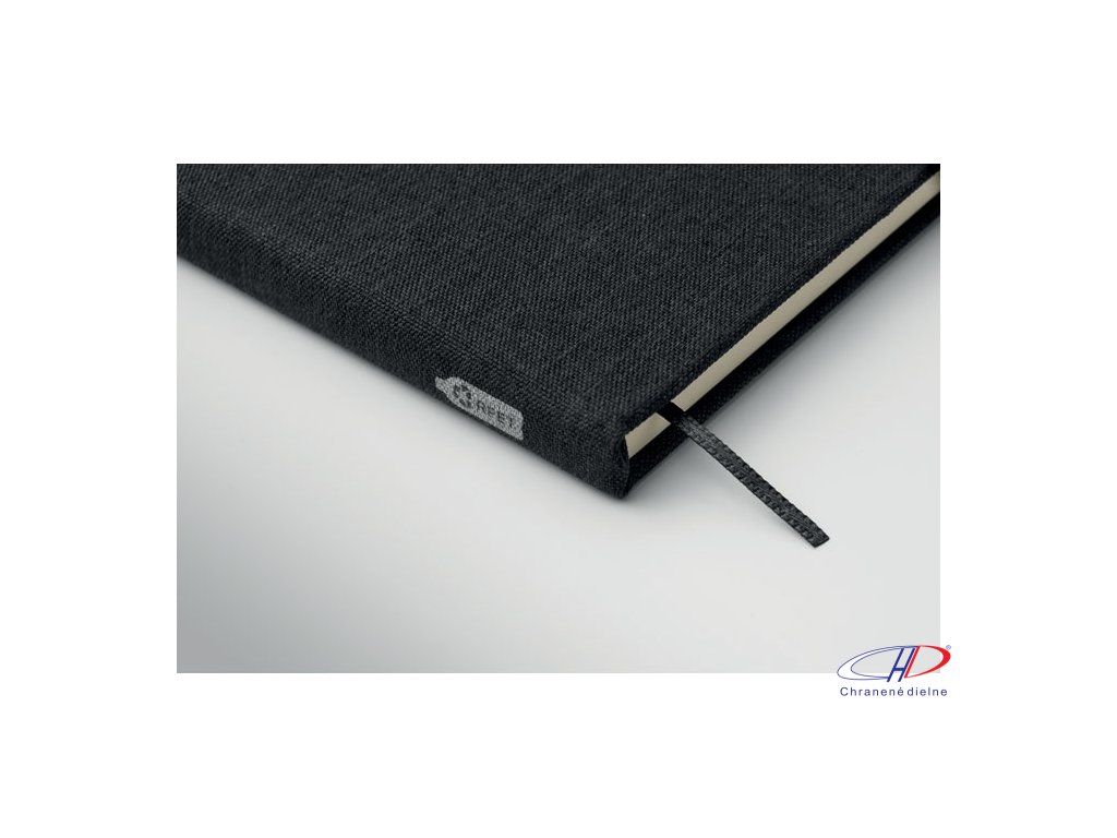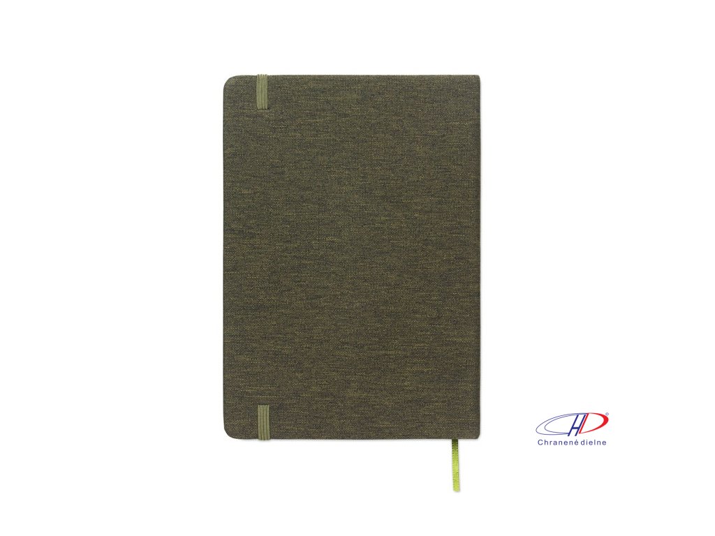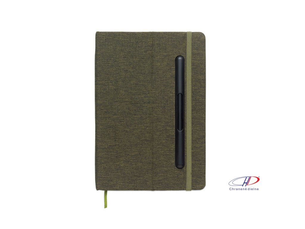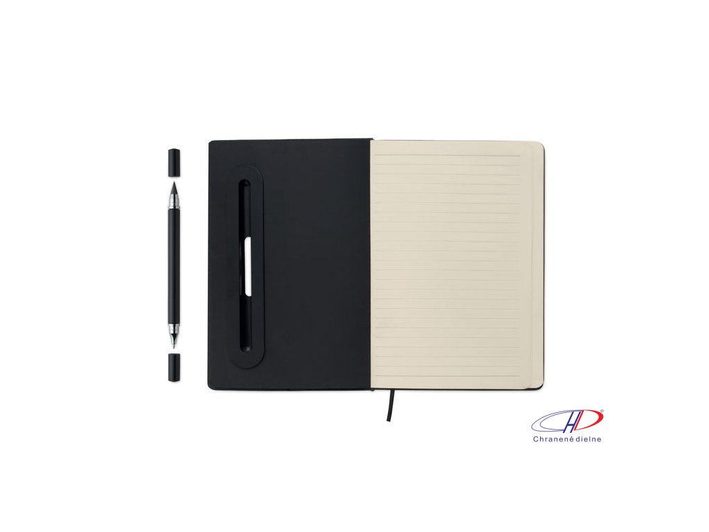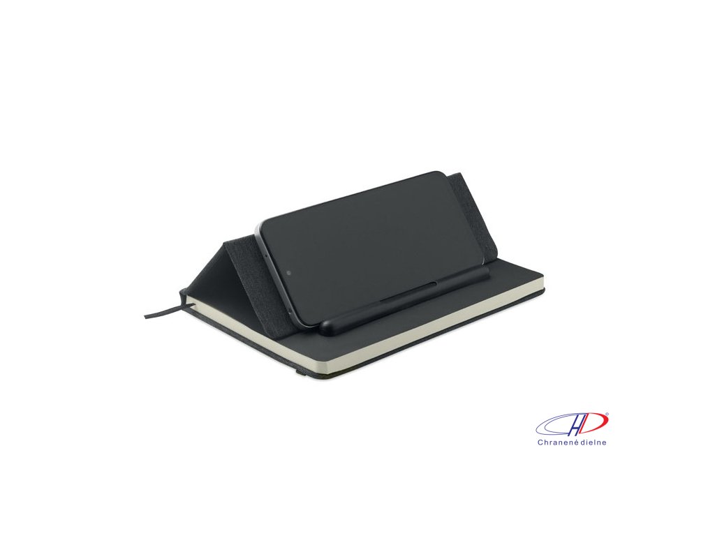 Zápisník A5 s tvrdým obalom z RPET s funkciou držiaka na telefón. Integrované 2-v-1 guľôčkové pero bez atramentu a bežné guľôčkové pero z ABS materiálu. Pevný obal. 192 linajkových strán z recyklovaného papiera (96 listov). Pútko a záložka.Dodatočné parametre