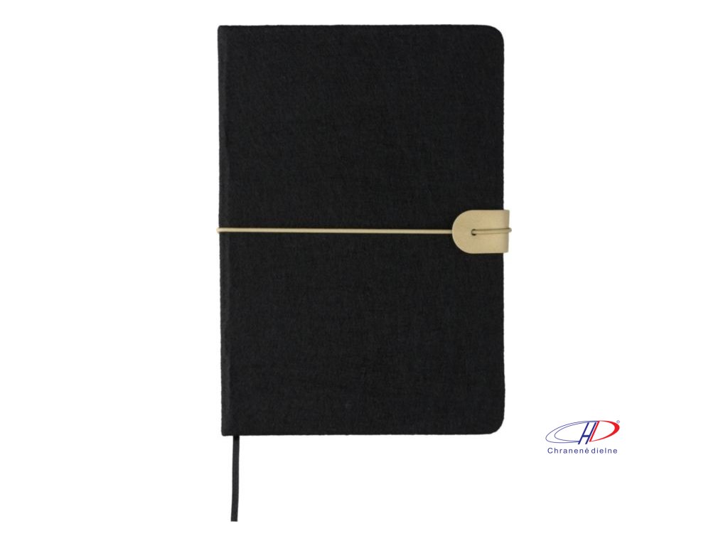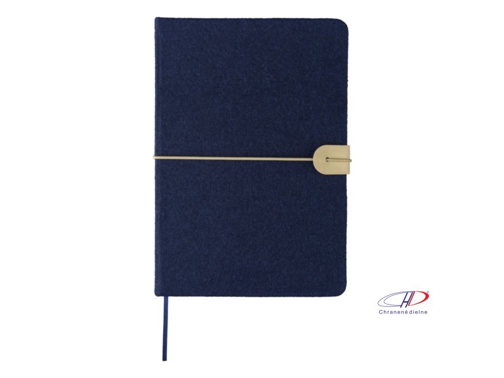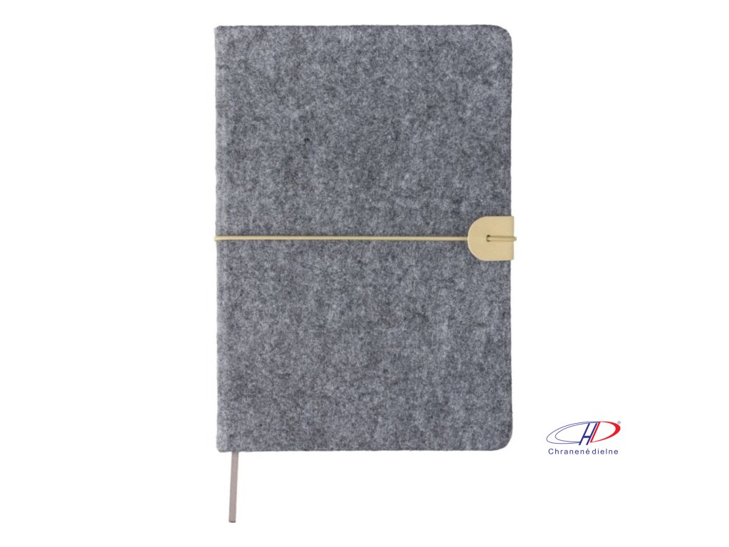 Zápisník z recyklovaného filcu s mäkkou 1 mm pevnou väzbou, gumičkou a PU zapínaním na vonkajšej strane. Súčasťou balenia je stužková záložka a 80 listov linajkového papiera s gramážou 70 g/m2. Na zadnej strane je laserom gravírované recyklované logo.Dodatočné parametre