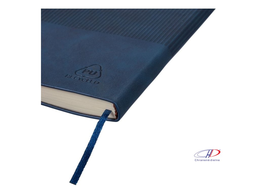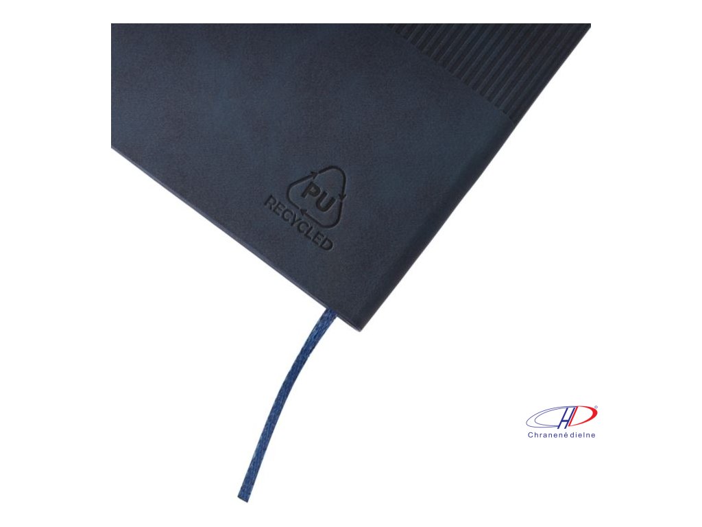 Zápisník z recyklovaného PU s tvrdou väzbou. Súčasťou je záložka so stuhou a 100 linajkových strán z 80 g/m2 papiera. Na zadnej strane je vyrazené recyklované logo.Dodatočné parametre