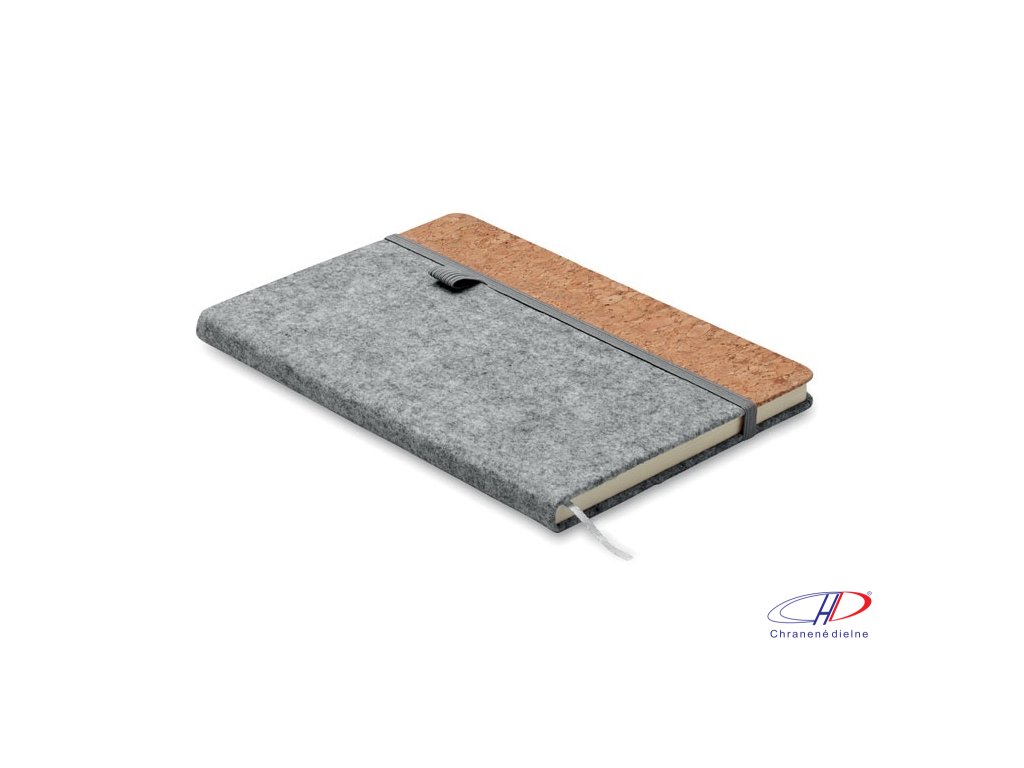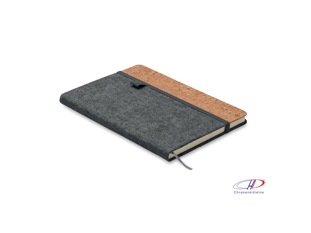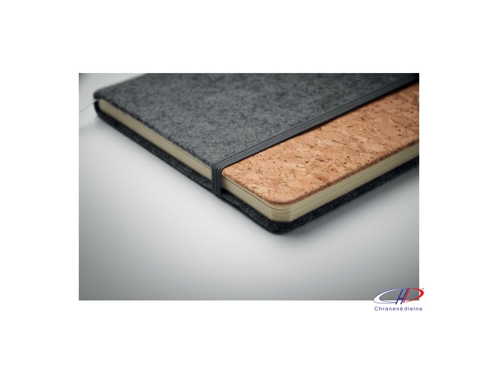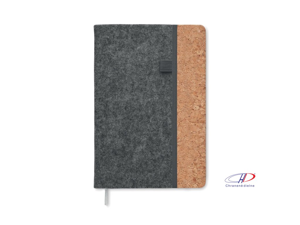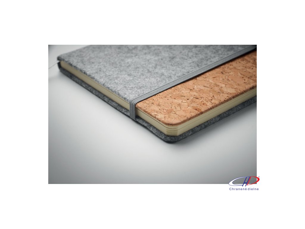 Zápisník A5 s RPET plsteným obalom a korkom. 160 linajkových strán z recyklovaného papiera (80 listov). Elastické pútko na pero vpredu, zodpovedajúci elastický remienok na zapínanie a záložka.Dodatočné parametre