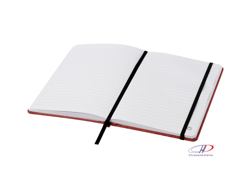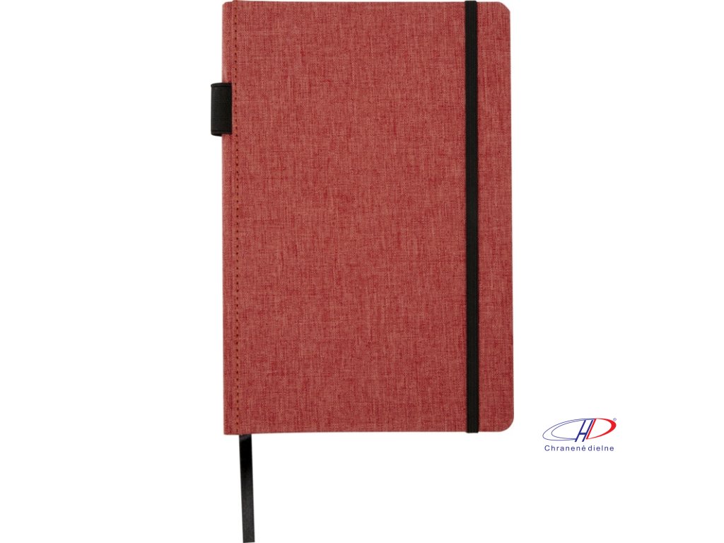 Poznámkový blok veľkosti A5 s obálkou z RPET tkaniny. Obsahuje 96 listov linkovaného recyklovaného papiera 70 g/m? so stuhovou záložkou a očkom na pero. Lepenkový obal.Dodatočné parametre