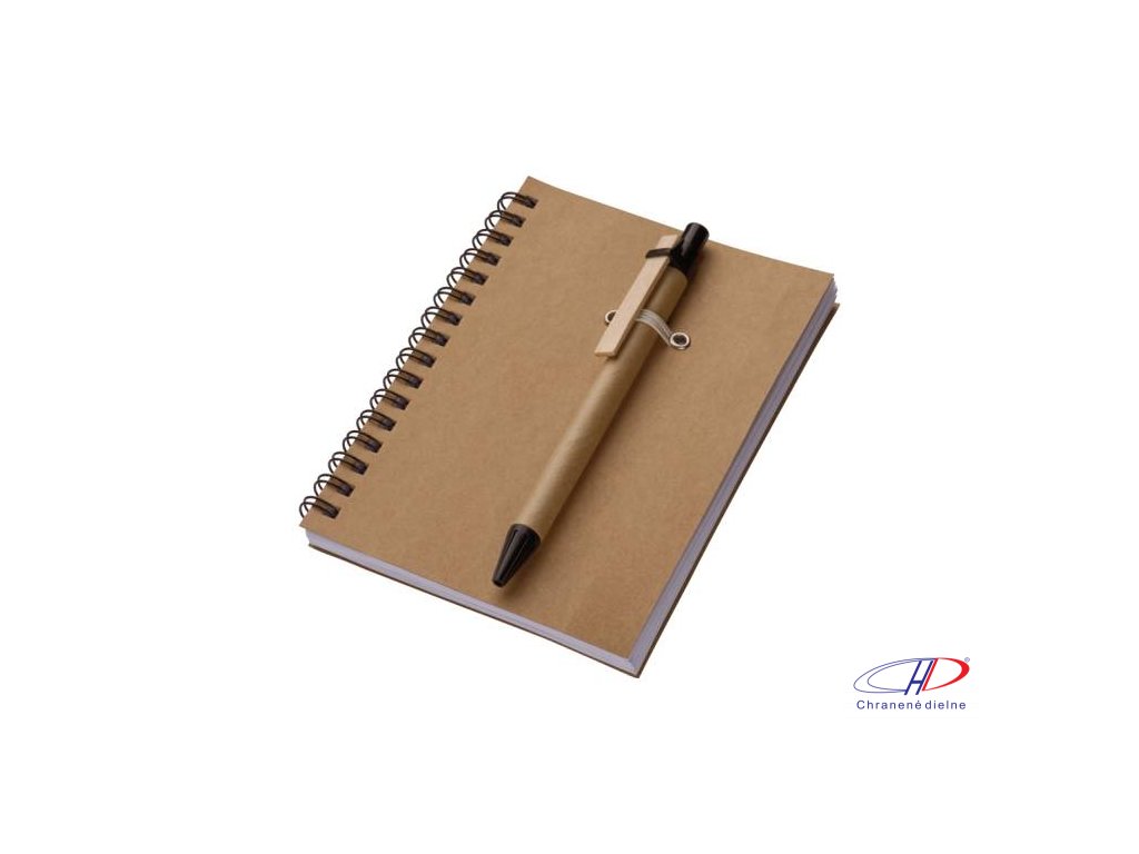 Kartónový zápisník A6 z recyklovaného papiera s perom s modrým atramentom. Zápisník má 60 linajkových strán.Dodatočné parametre