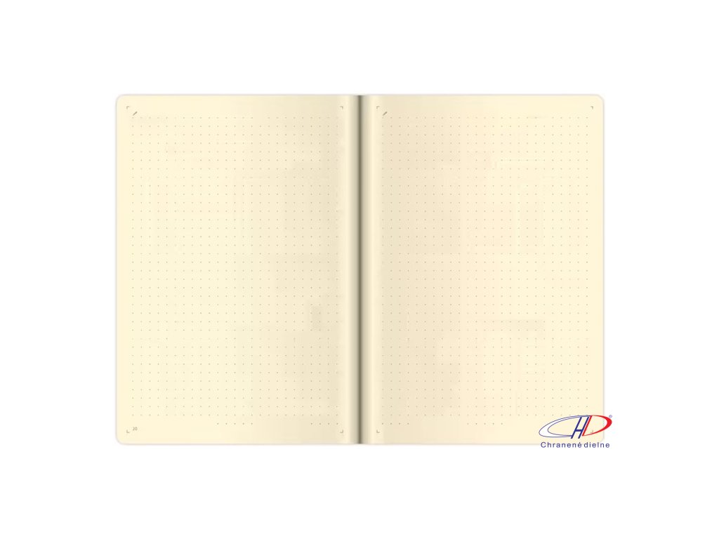 Bodkovaný zápisník (štvorčekový). Pútko na pero a praktická papierová kapsička vzadu. 3 hárky samolepiek pre vlastné použitie.Dodatočné parametre
