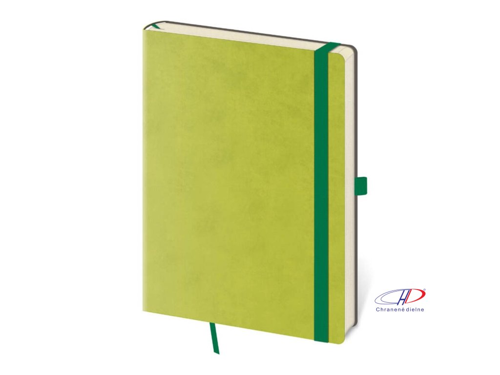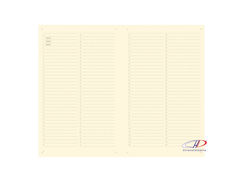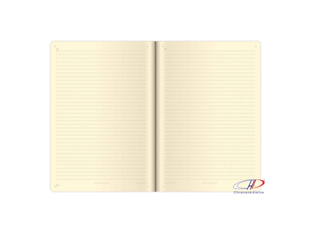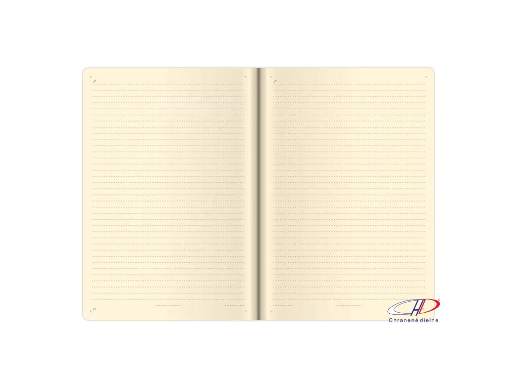 Linajkové strany (bodkované linajky). Pútko na pero a praktická papierová kapsička vzadu. 3 hárky samolepiek pre vlastné použitie.Dodatočné parametre