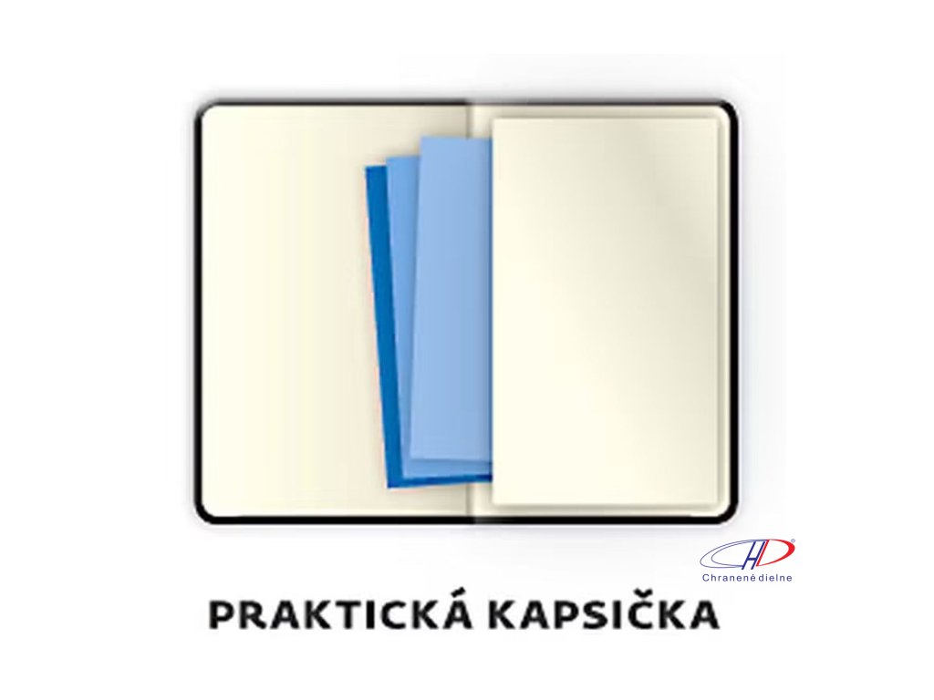 Bodkovaný zápisník (štvorčekový). Praktická papierová kapsička vzadu. 3 hárky samolepiek pre vlastné použitie.Dodatočné parametre