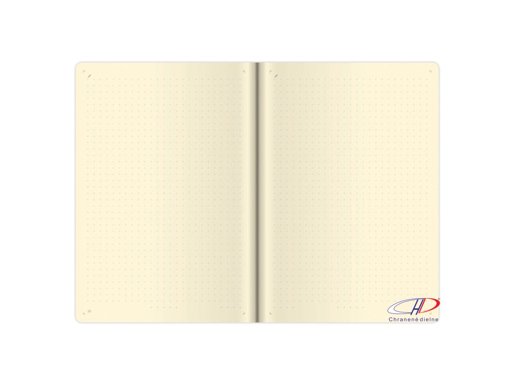 Bodkovaný zápisník (štvorčekový). Pútko na pero a praktická papierová kapsička vzadu. 3 hárky samolepiek pre vlastné použitie.Dodatočné parametre