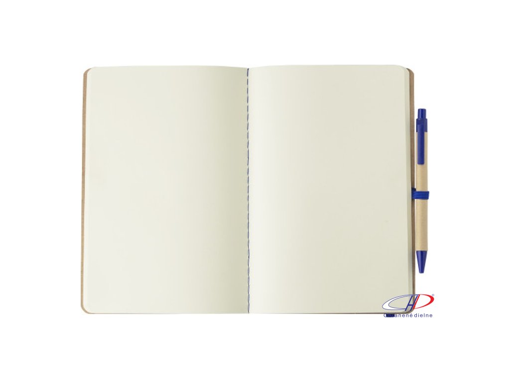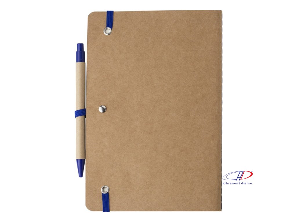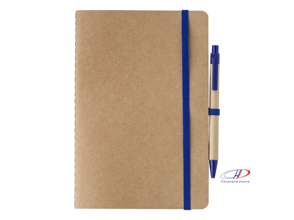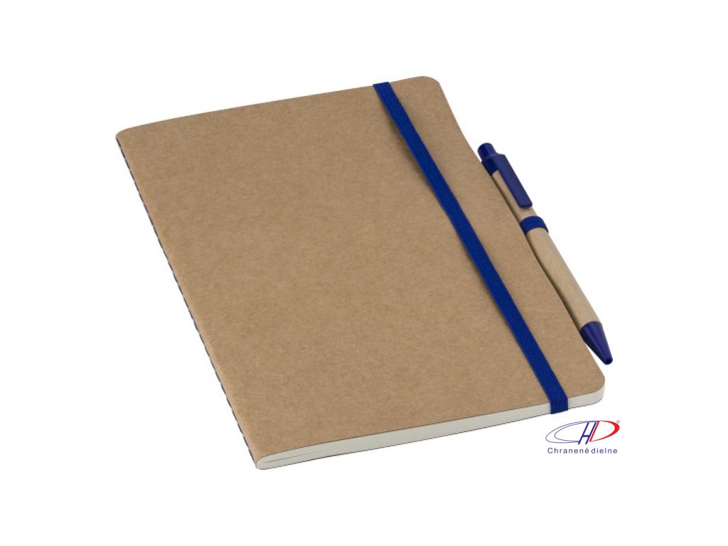 Zápisník z recyklovaného kartónu (A5) so 120 bielymi stranami. So zodpovedajúcim perom z lepenky/pšeničnej slamy (modrá náplň). S gumičkou a pútkom na pero v rovnakej farbe.Dodatočné parametre