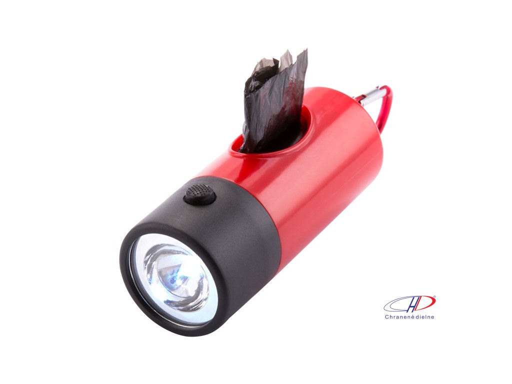 Plastový zásobník na psie odpadky s 1LED svetlom, 15timi vreckami a hliníkovou karabínkou, vr. gombíkových batérií.Dodatočné parametre