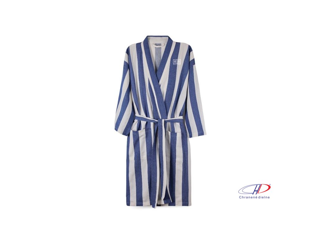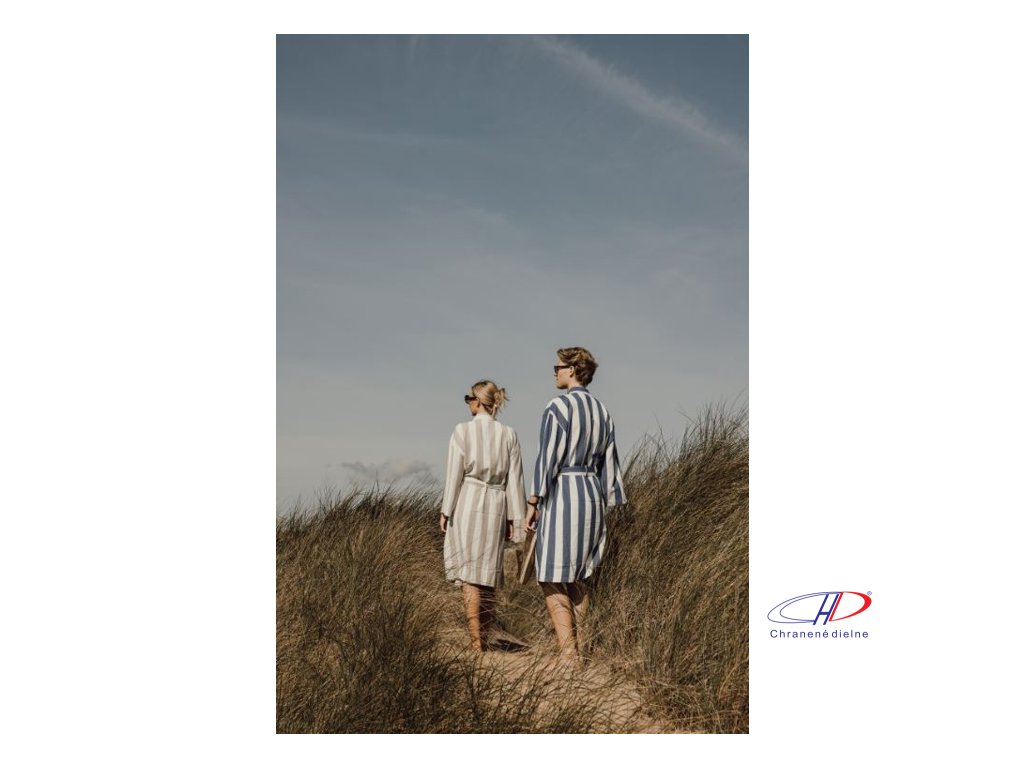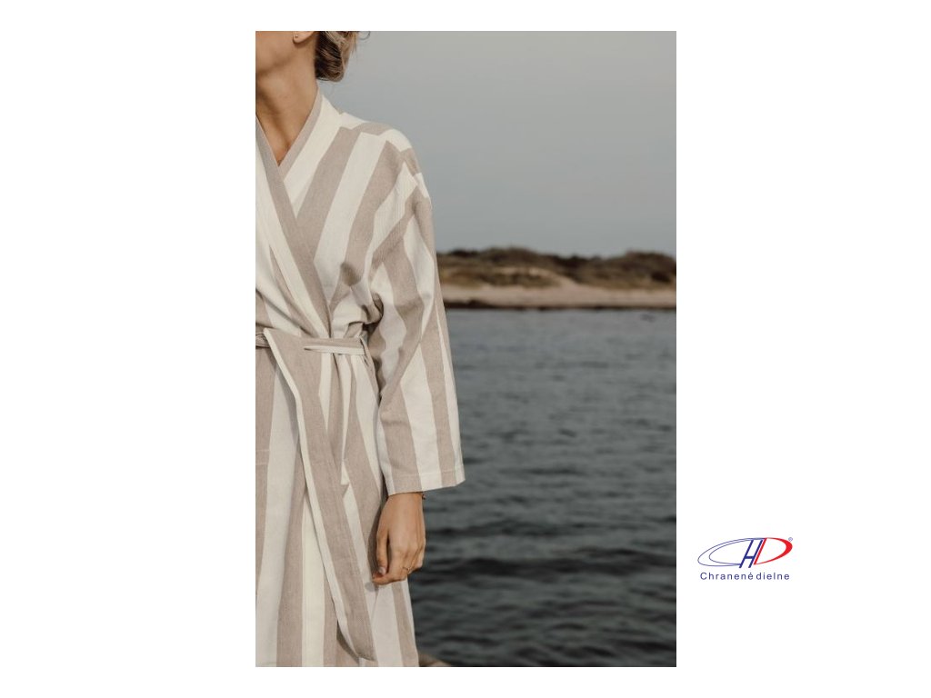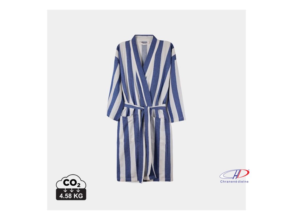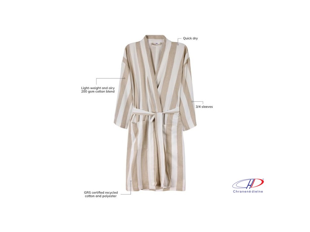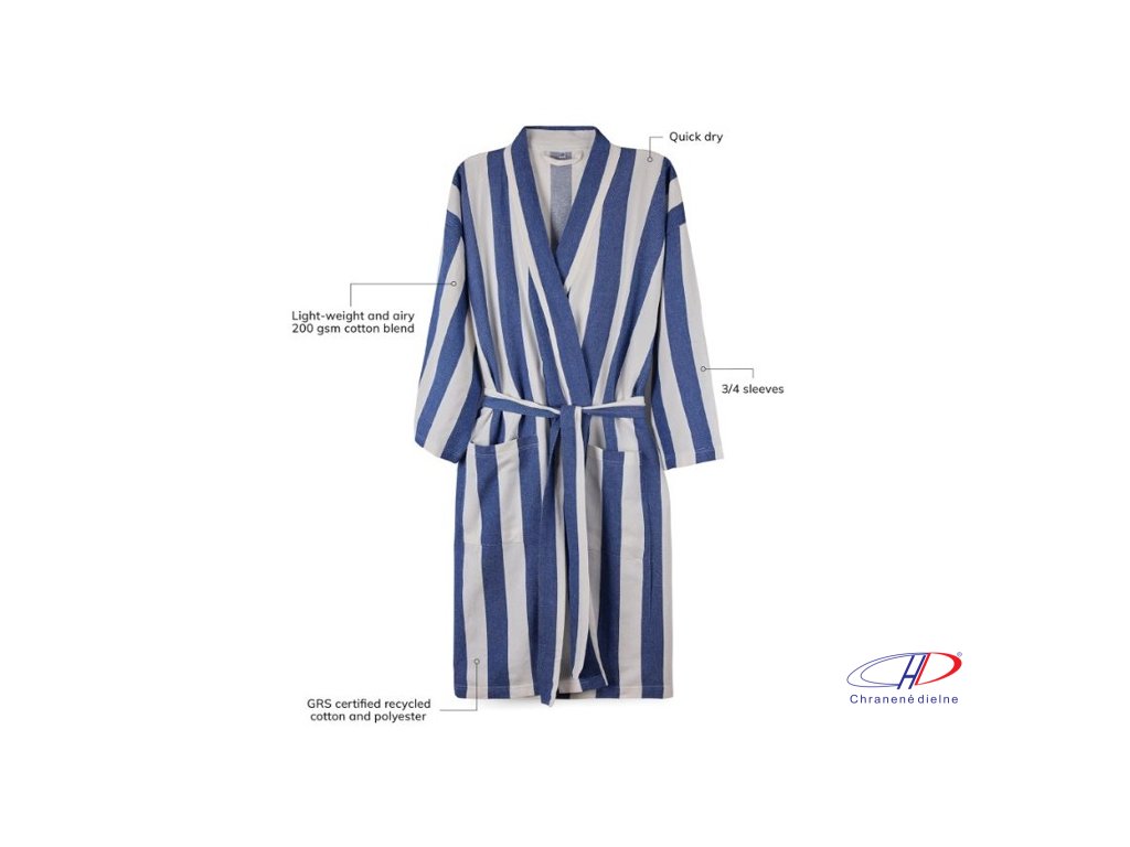 Mäkký župan z ľahkej a vzdušnej zmesi (200 g/m2) a kombinuje pohodlie bavlny s rýchloschnúcimi vlastnosťami polyesteru. Je navrhnutý s dvojfarebným pruhovaným vzorom, má elegantný golier, predné vrecká, 3/4 rukávy a opasok v páse. Certifikácia GRS.Dodatočné parametre