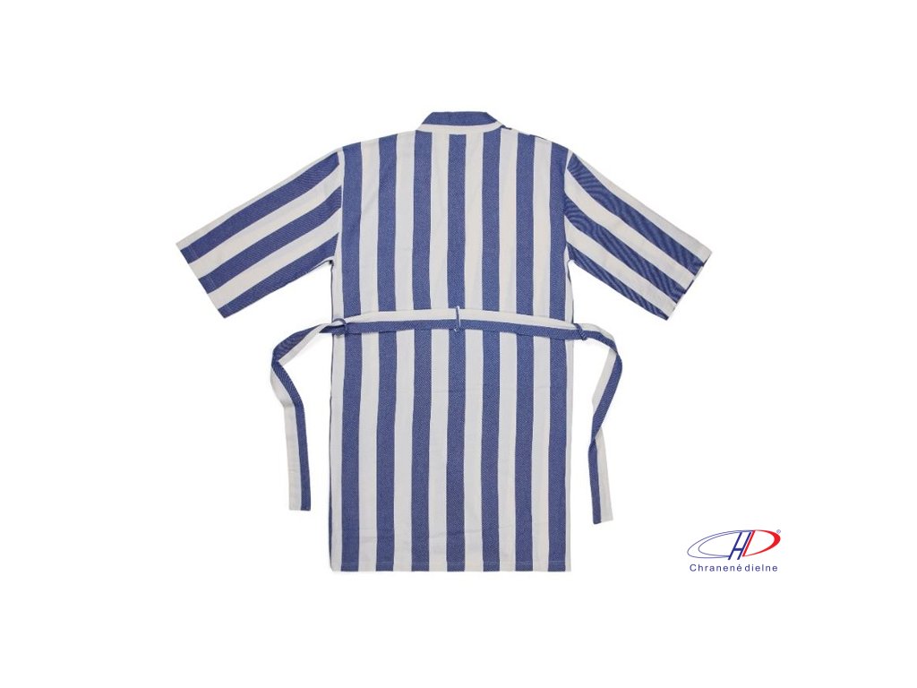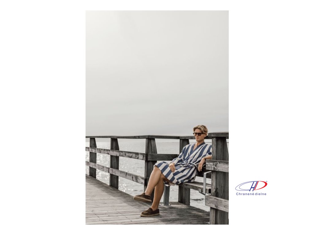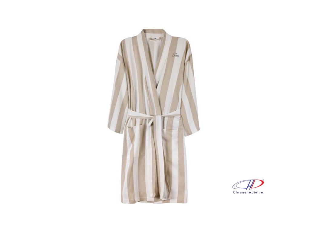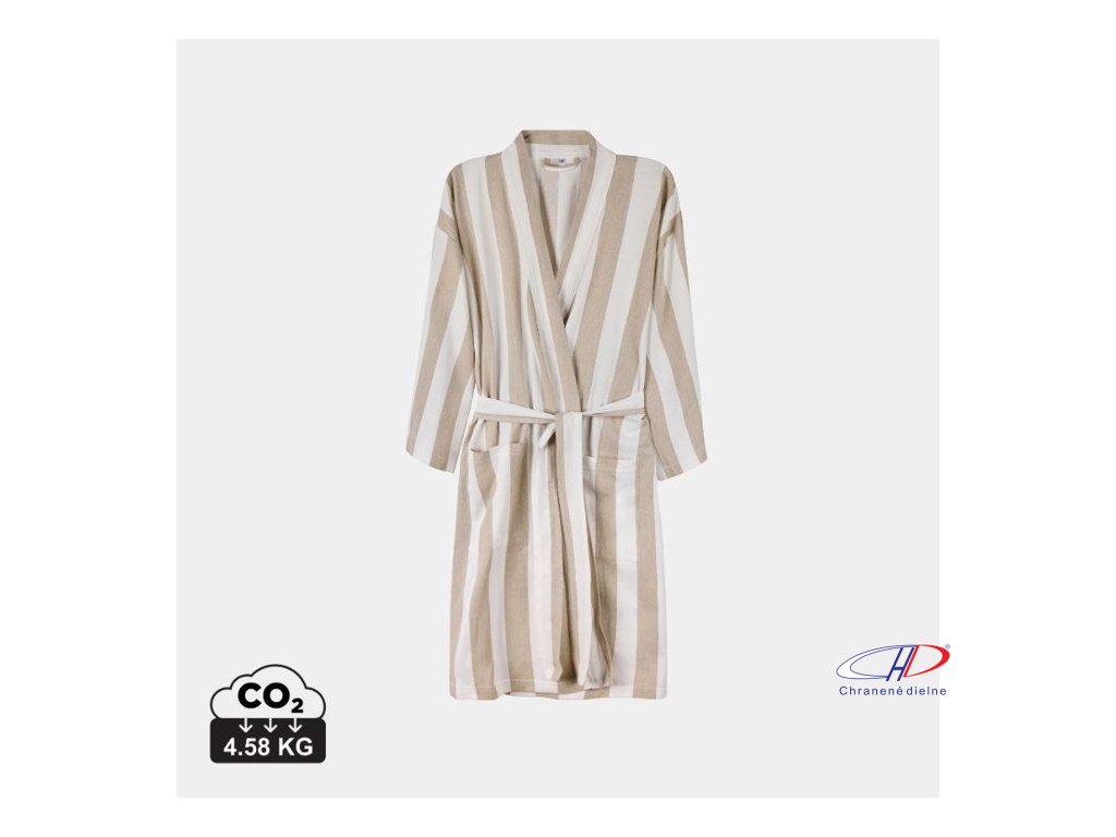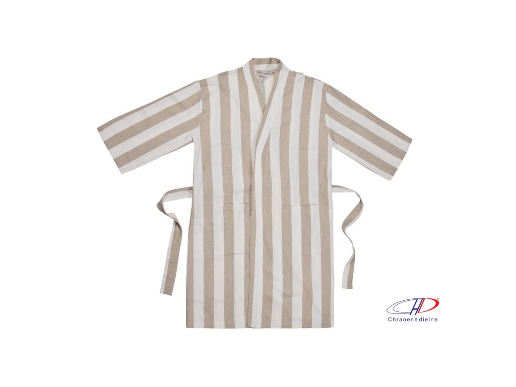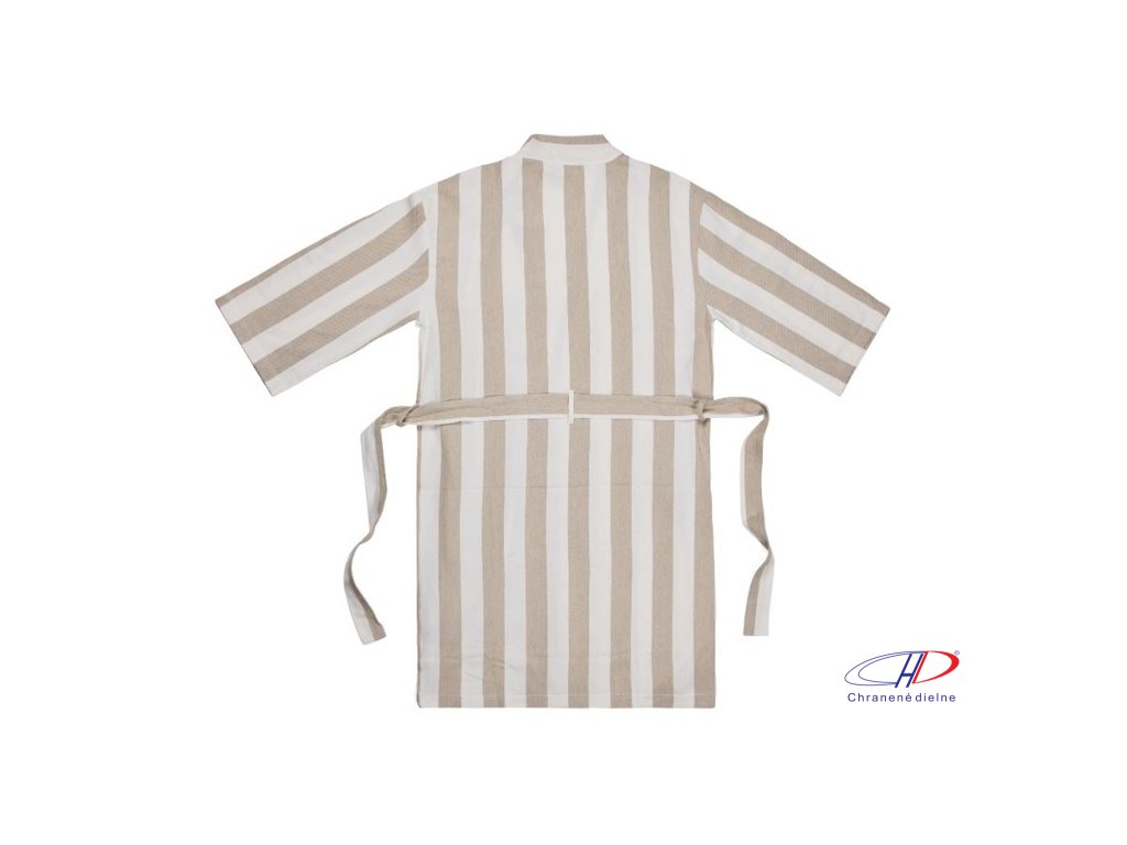 Mäkký župan z ľahkej a vzdušnej zmesi (200 g/m2) a kombinuje pohodlie bavlny s rýchloschnúcimi vlastnosťami polyesteru. Je navrhnutý s dvojfarebným pruhovaným vzorom, má elegantný golier, predné vrecká, 3/4 rukávy a opasok v páse. Certifikácia GRS.Dodatočné parametre