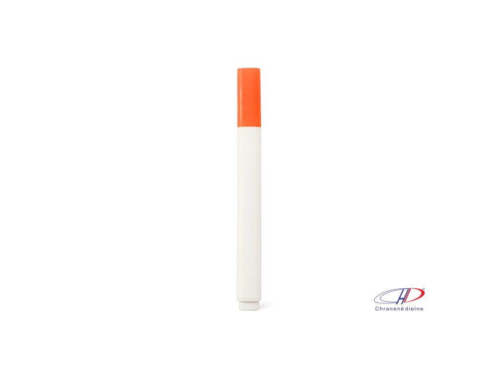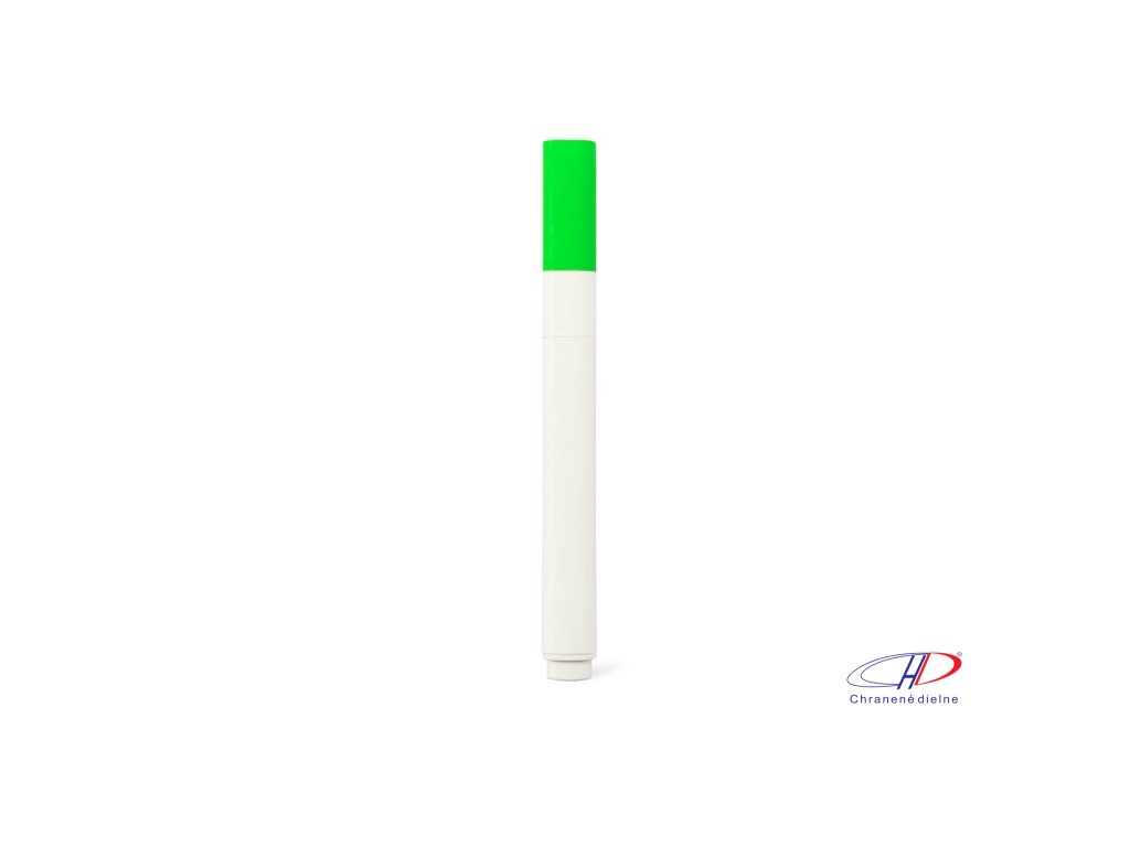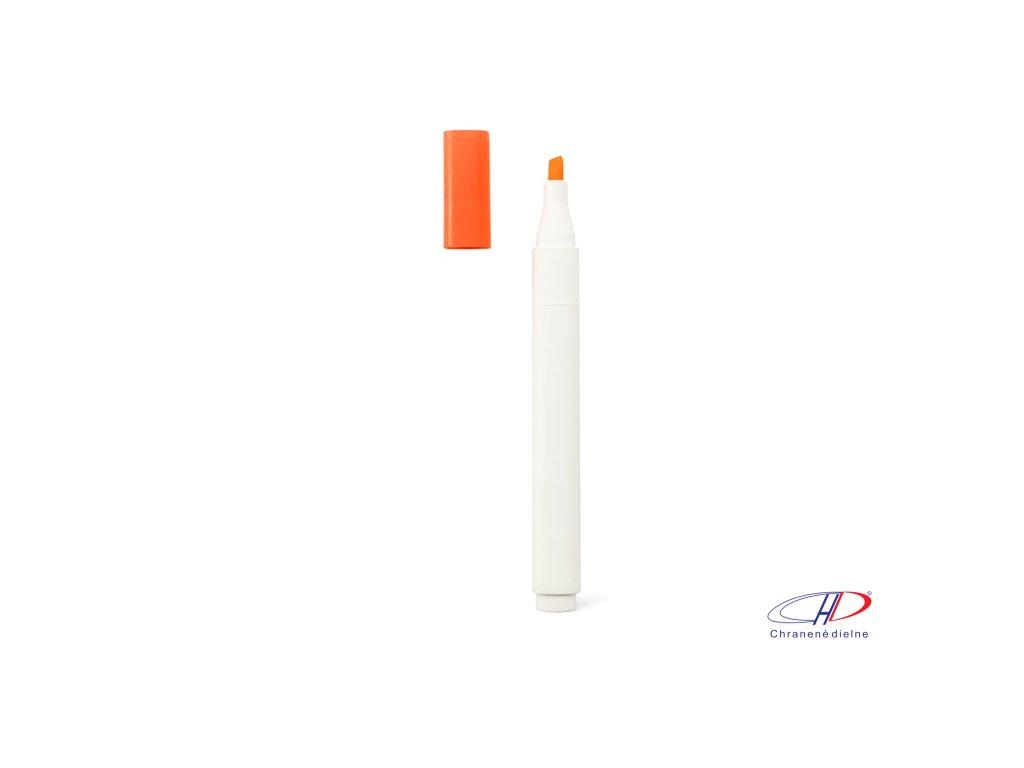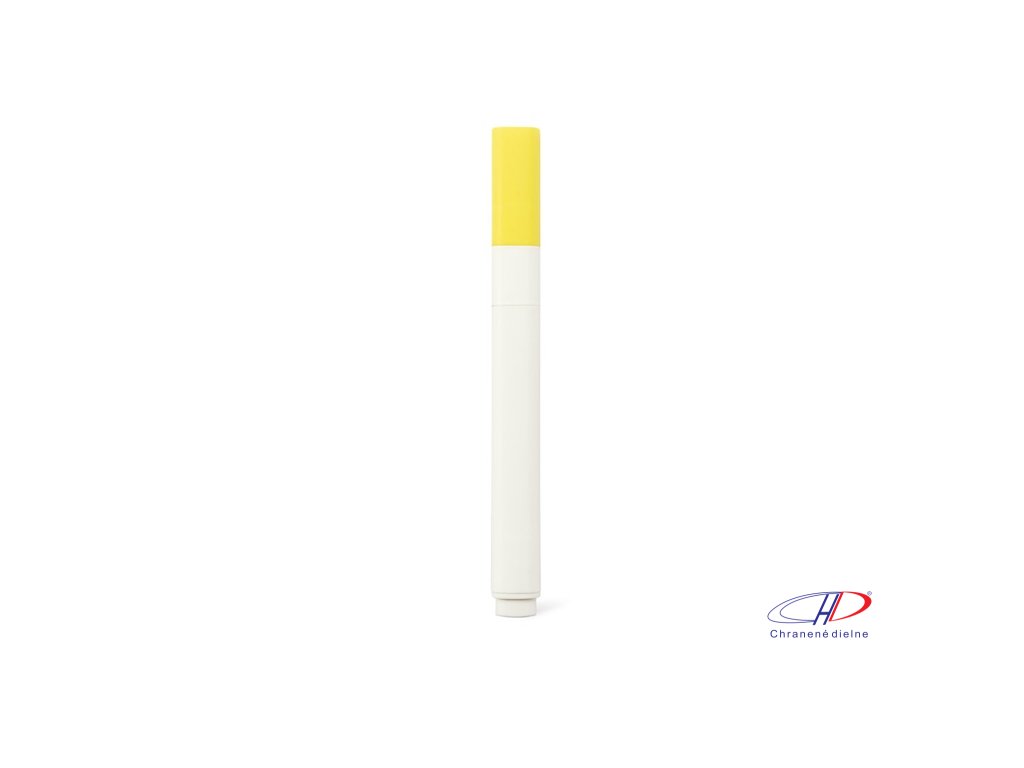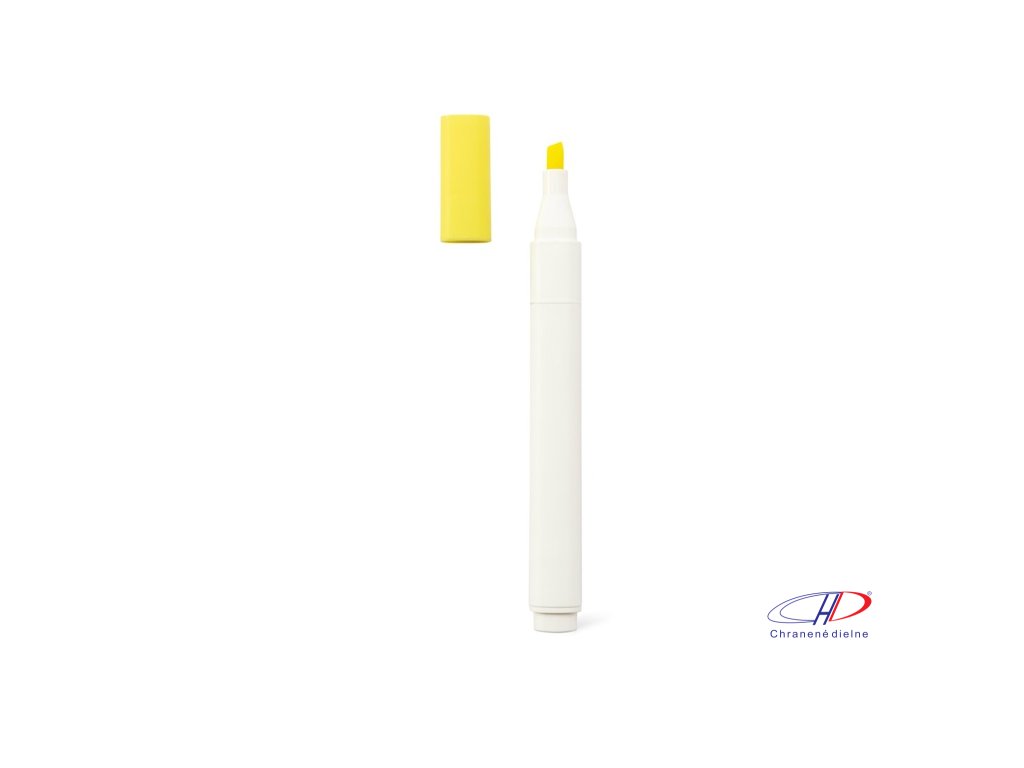 Zvýrazňovač z PP s matným povrchom. Má biele telo a viečko, ktoré ladí s farbou zvýrazňovača.
